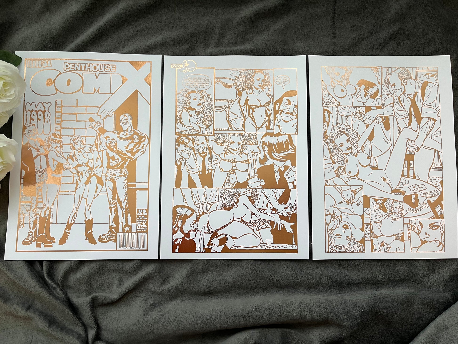 Includes Penthouse Comix comic cover and 2 pages of comic strips in rose gold. Perfect for a 'man cave' setting, bachelor pad or for a newly single man/woman. Explicit content!