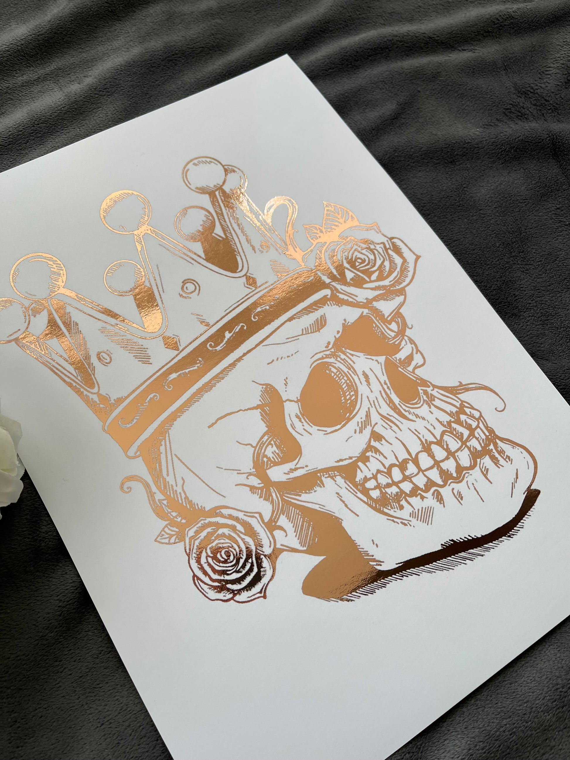 A stunning fusion of elegance and edginess that will add a touch of royalty to your decor. This unique artwork features a striking skull adorned with a majestic crown, brought to life through exquisite rose gold foil printing.