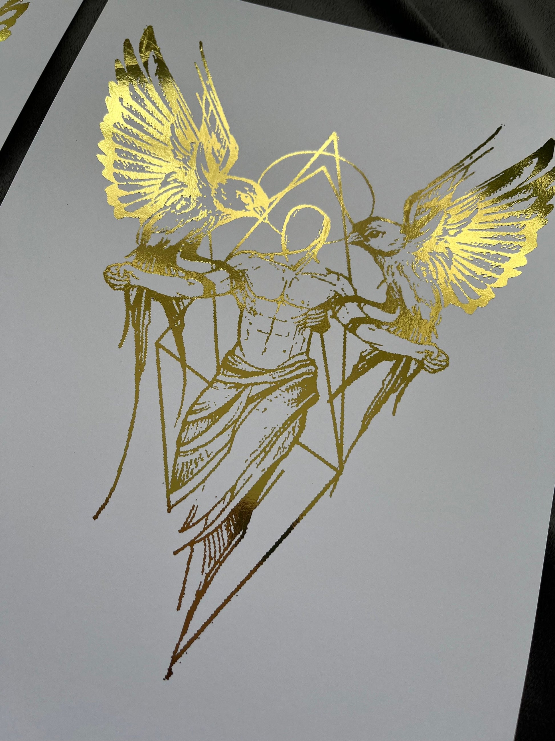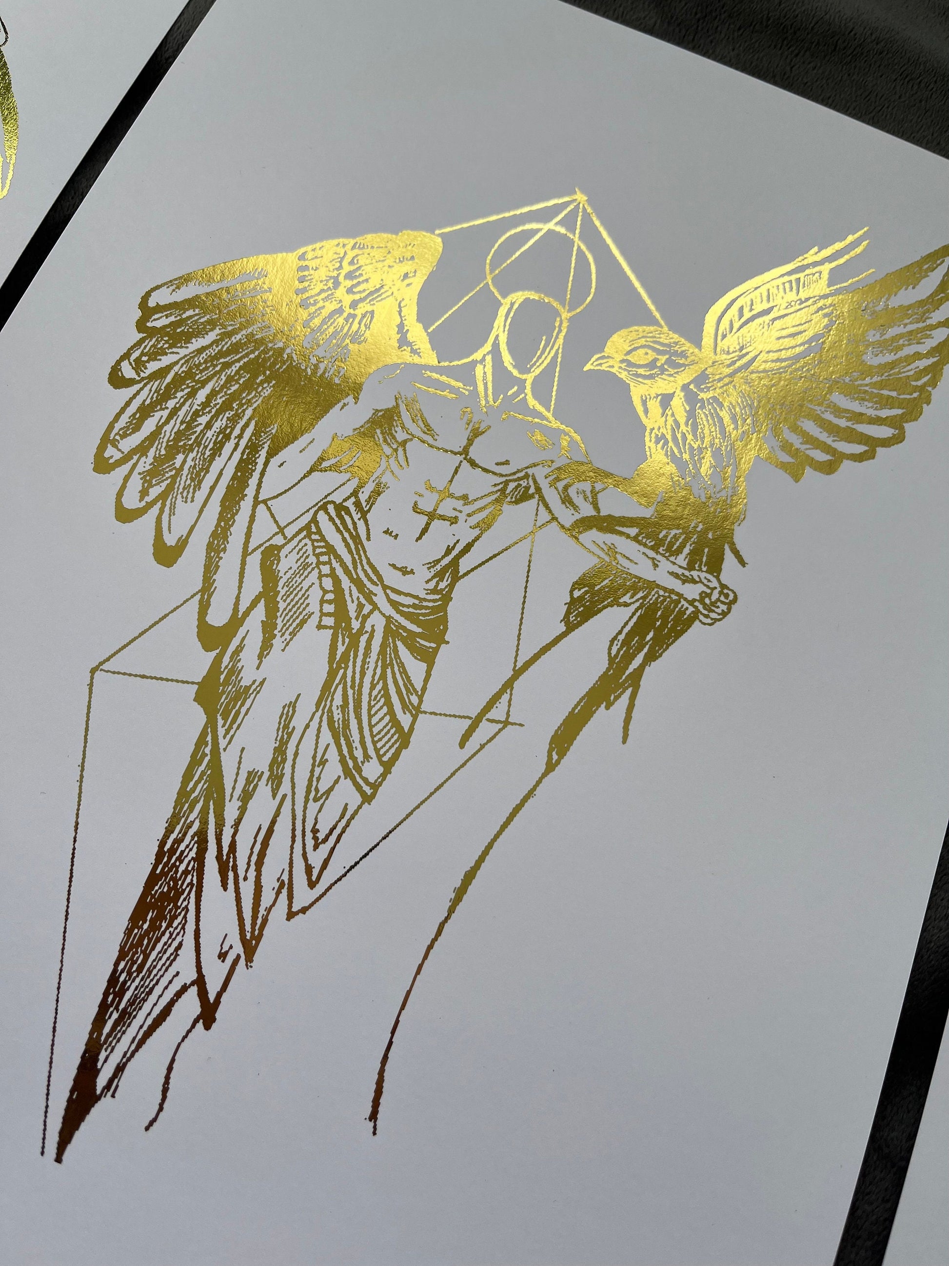 A set of 3 foil printed male angels would make a beautiful addition to any home décor. The foil printing technique adds a unique, shimmering effect to the angels, giving them a dazzling and ethereal appearance. The set includes three different male angel designs, each with its own unique features and details. These angels would be a perfect gift for anyone who loves angels or appreciates the beauty of religious artwork.