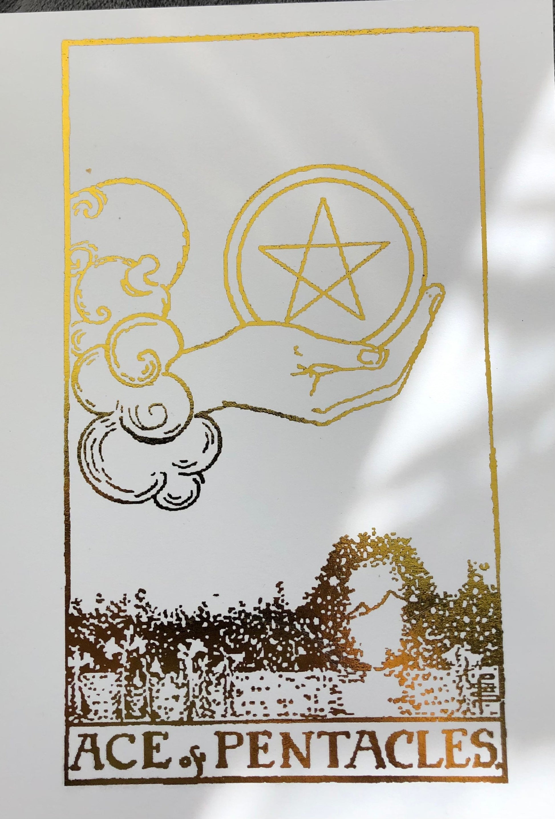 A mystical and enchanting set of four tarot cards that invite positive energies and good fortune into your life. This exclusive set features the Ace of Cups, The Sun, The Star, and The Ace of Pentacles, beautifully rendered in shimmering gold foil accents, capturing the essence of these powerful symbols of abundance, hope, and joy.
