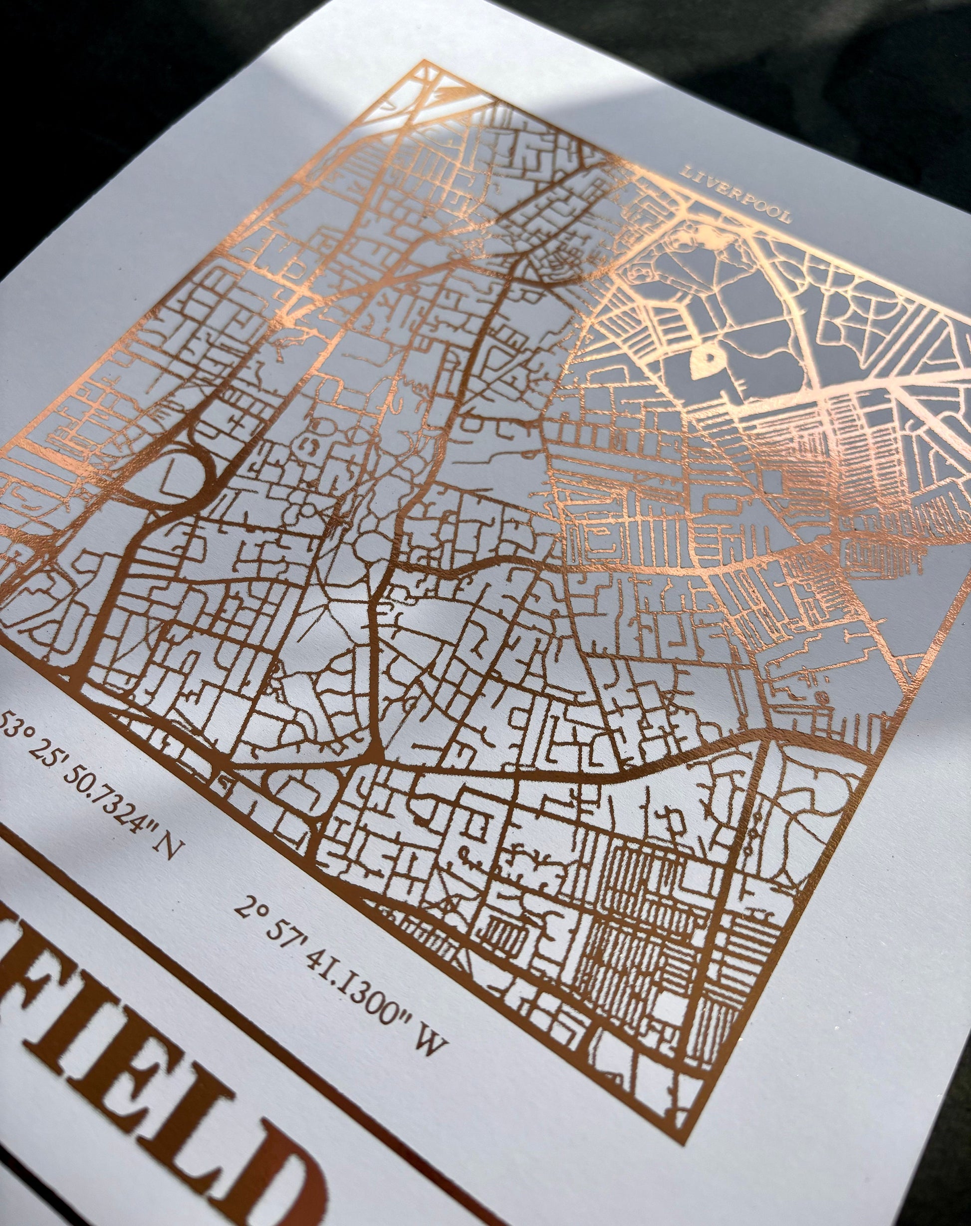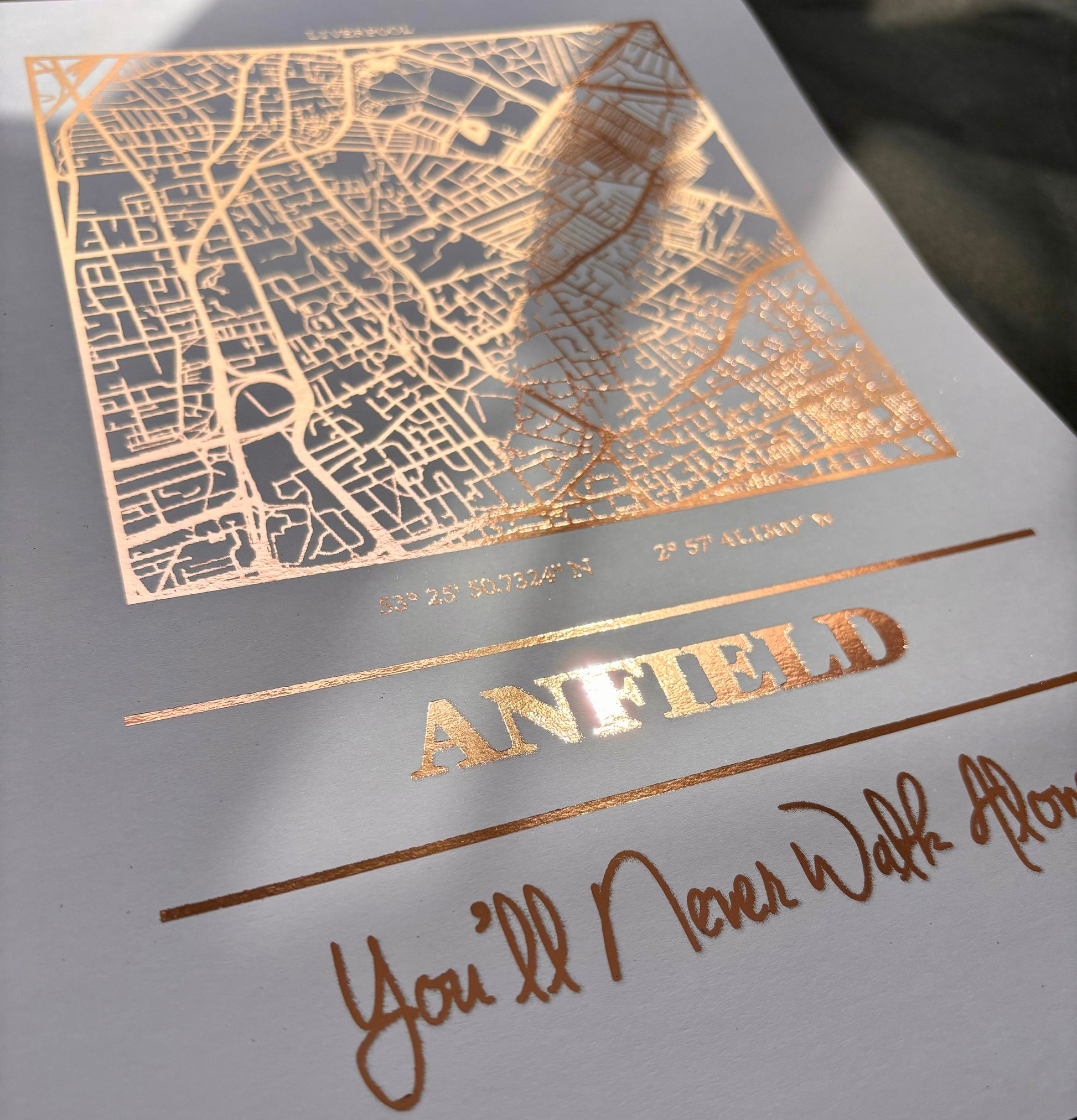 Introducing our exquisite foil printed map of Anfield Stadium, the legendary home of Liverpool Football Club. Crafted with meticulous attention to detail, this artwork pays homage to the iconic stadium that has been the heart and soul of the Reds for generations.