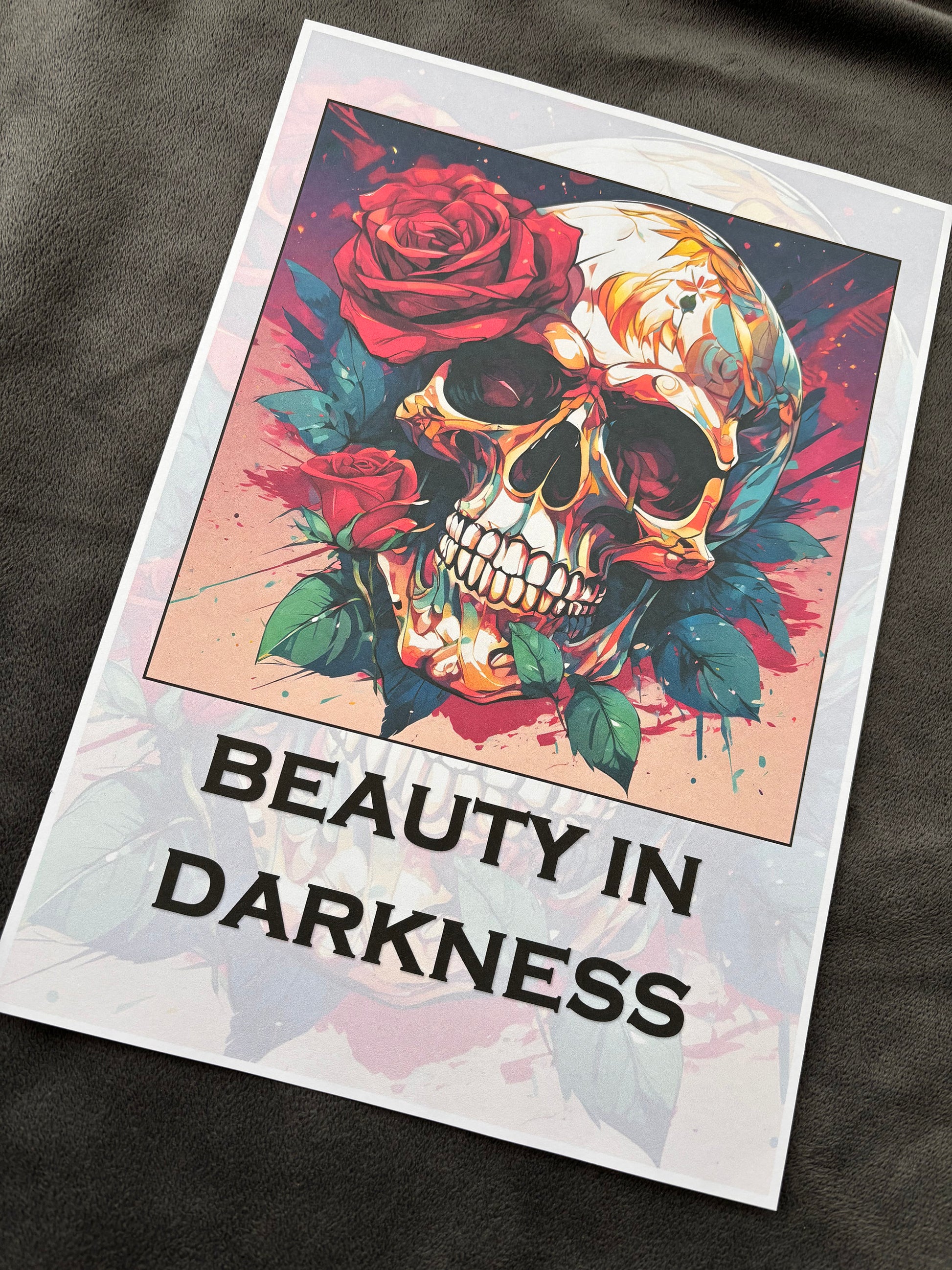 Evoke intrigue and beauty with our skull and rose print featuring the captivating slogan 'Beauty in Darkness'.