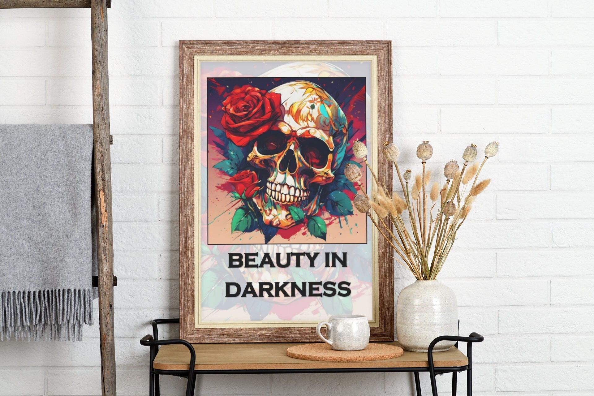This mesmerising artwork blends the delicate allure of a rose with the bold symbolism of a skull, creating a striking contrast that is both haunting and alluring. Perfect for those who embrace the darker side of beauty, this print adds a touch of mystery and elegance to any space. A must-have for art collectors and aficionados of the unconventional.