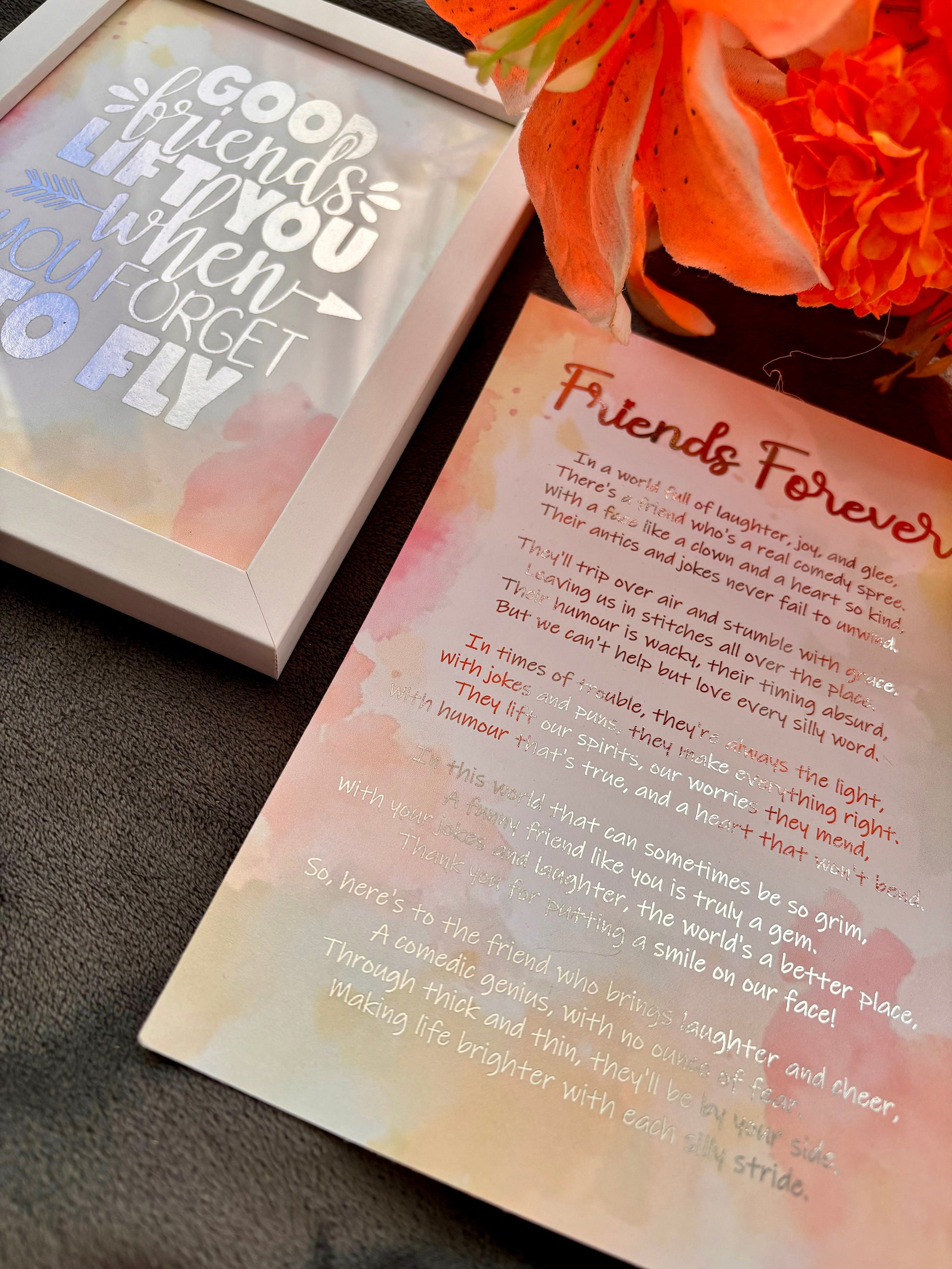Elevate the sentimental value of your gift with a beautifully foil-printed "Friends Forever" poem. Expressing the depth of your connection, this poetic tribute is a timeless keepsake that perfectly encapsulates the enduring nature of your friendship.