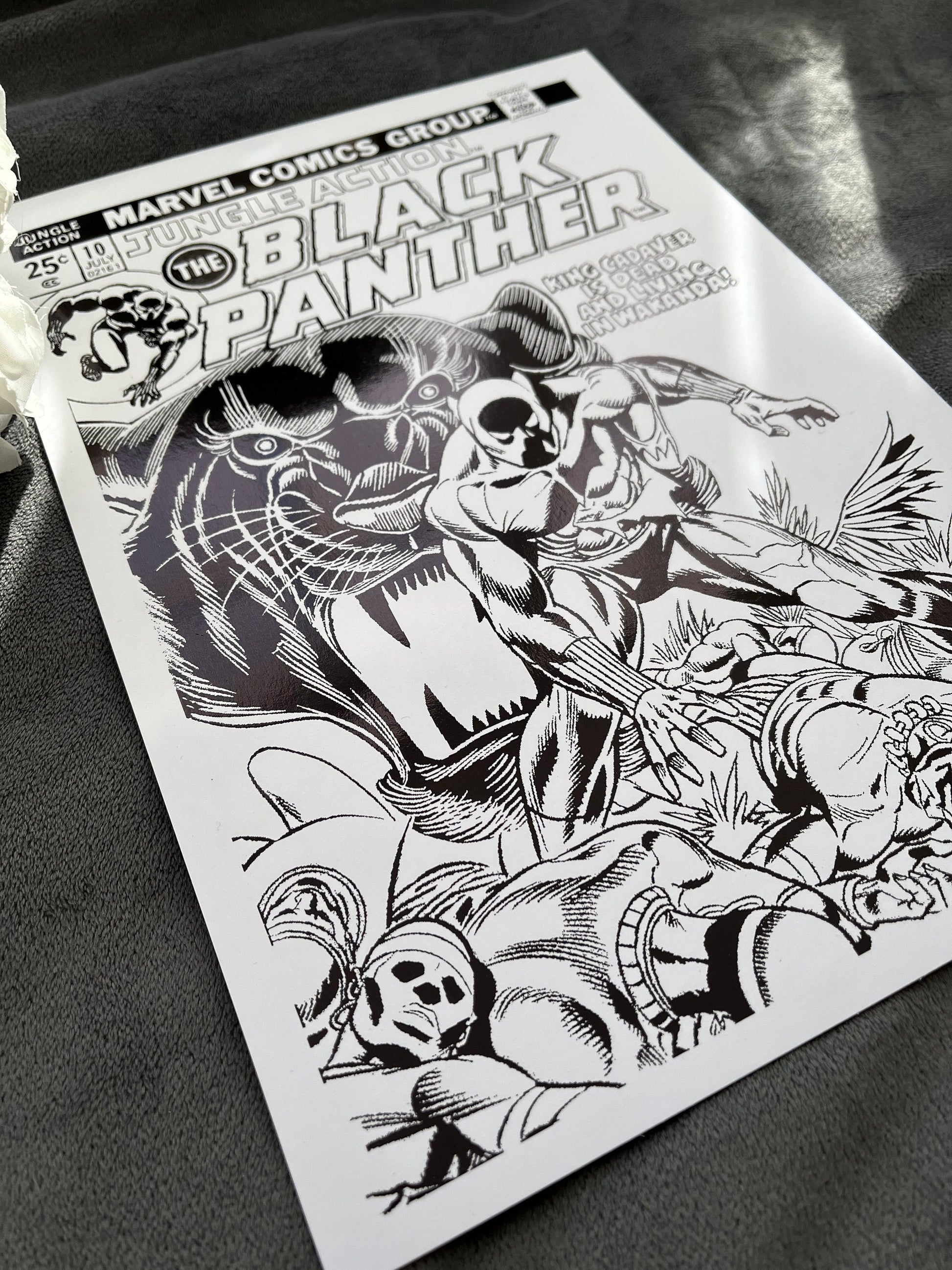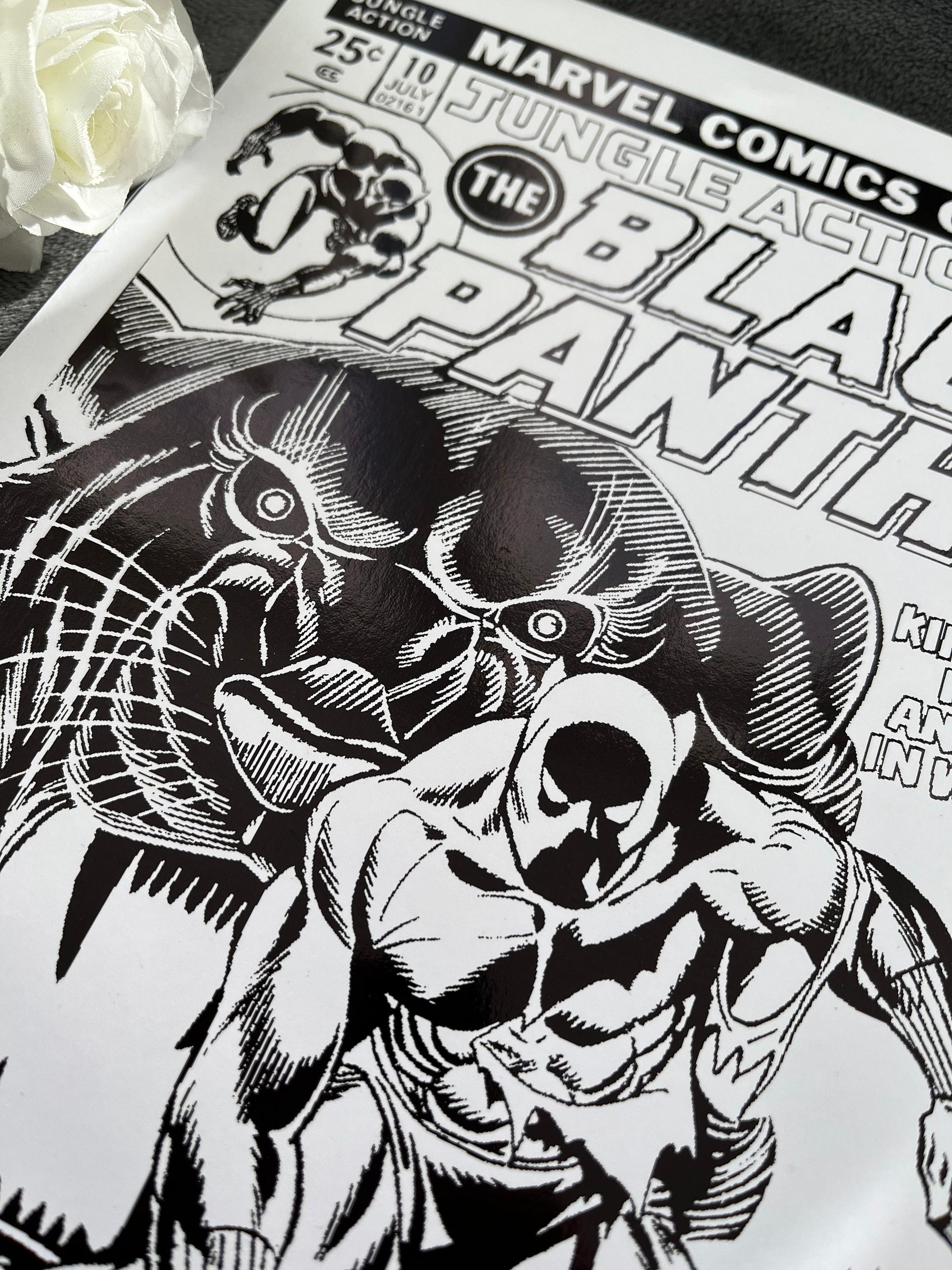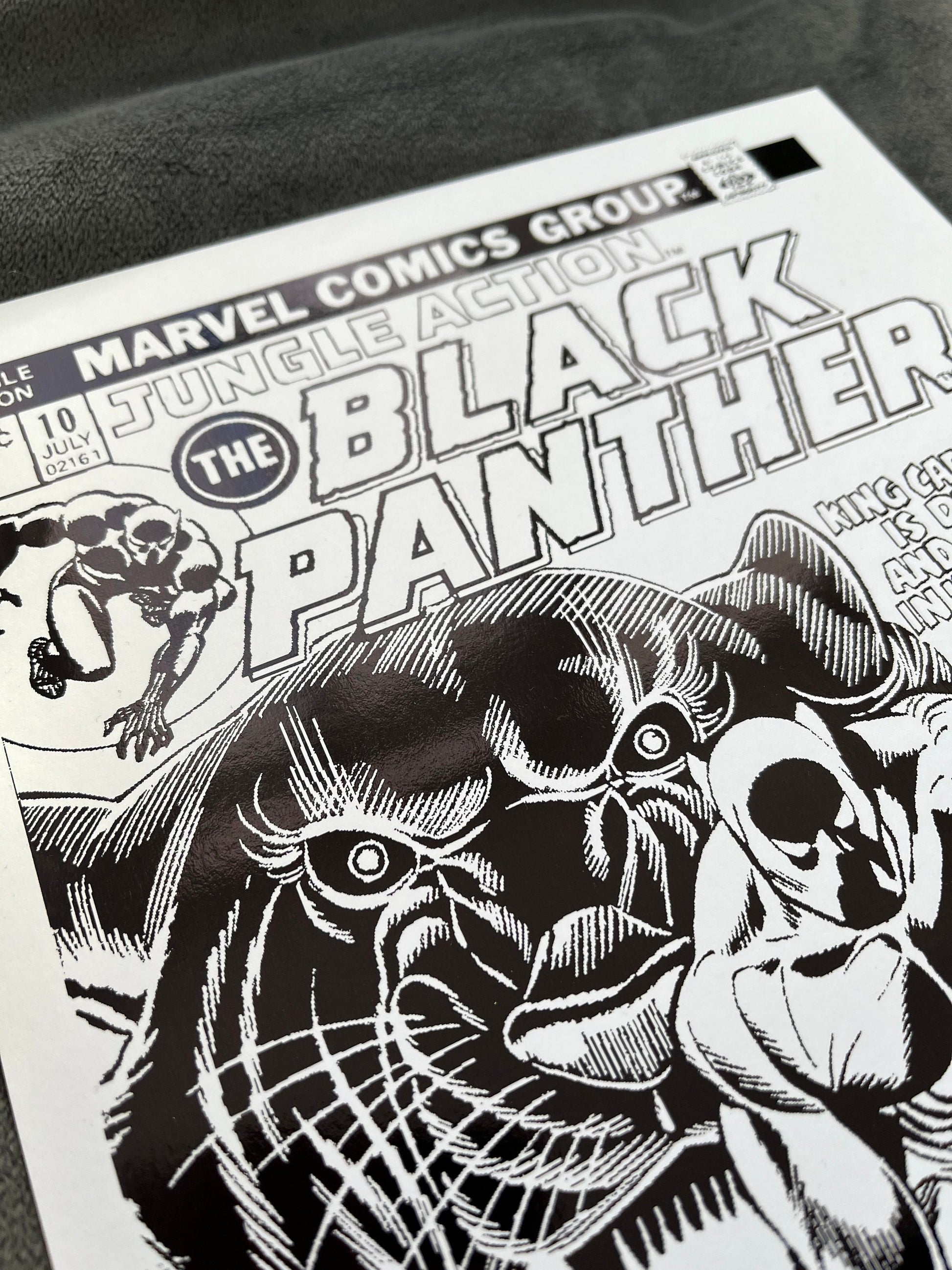 This exclusive artwork features a stunning Black Panther comic cover, beautifully adorned with sleek black foil accents.