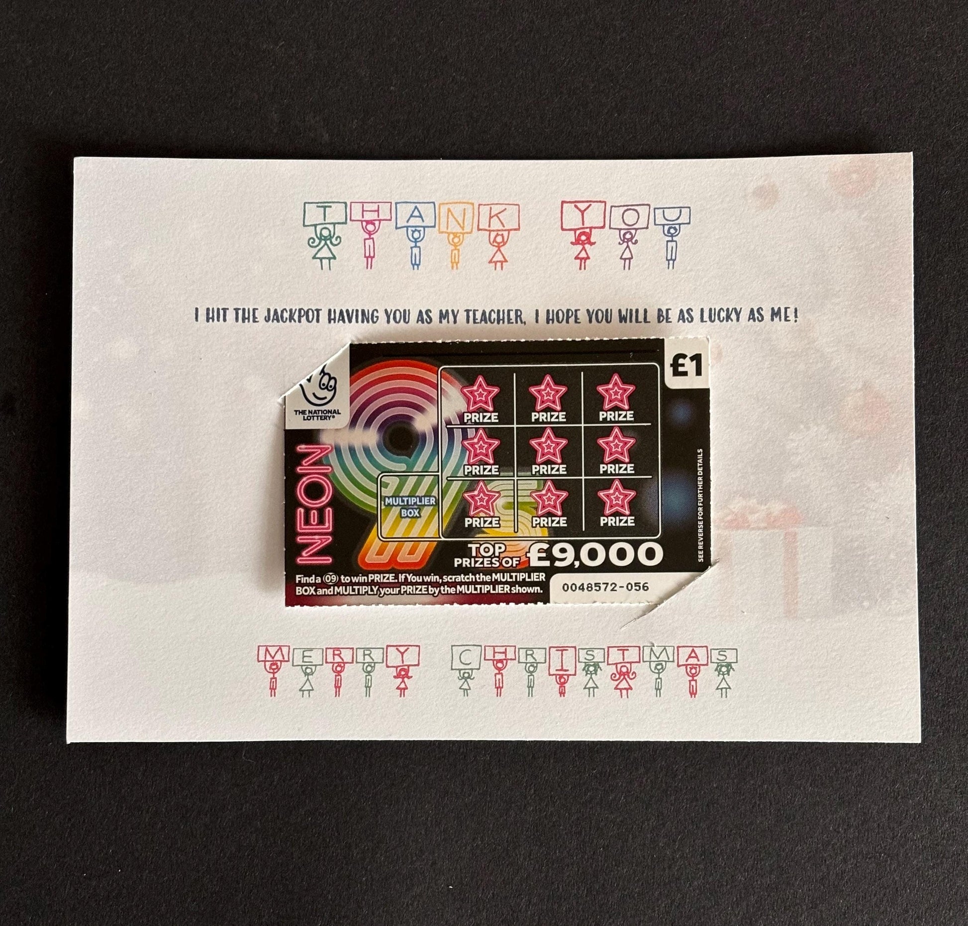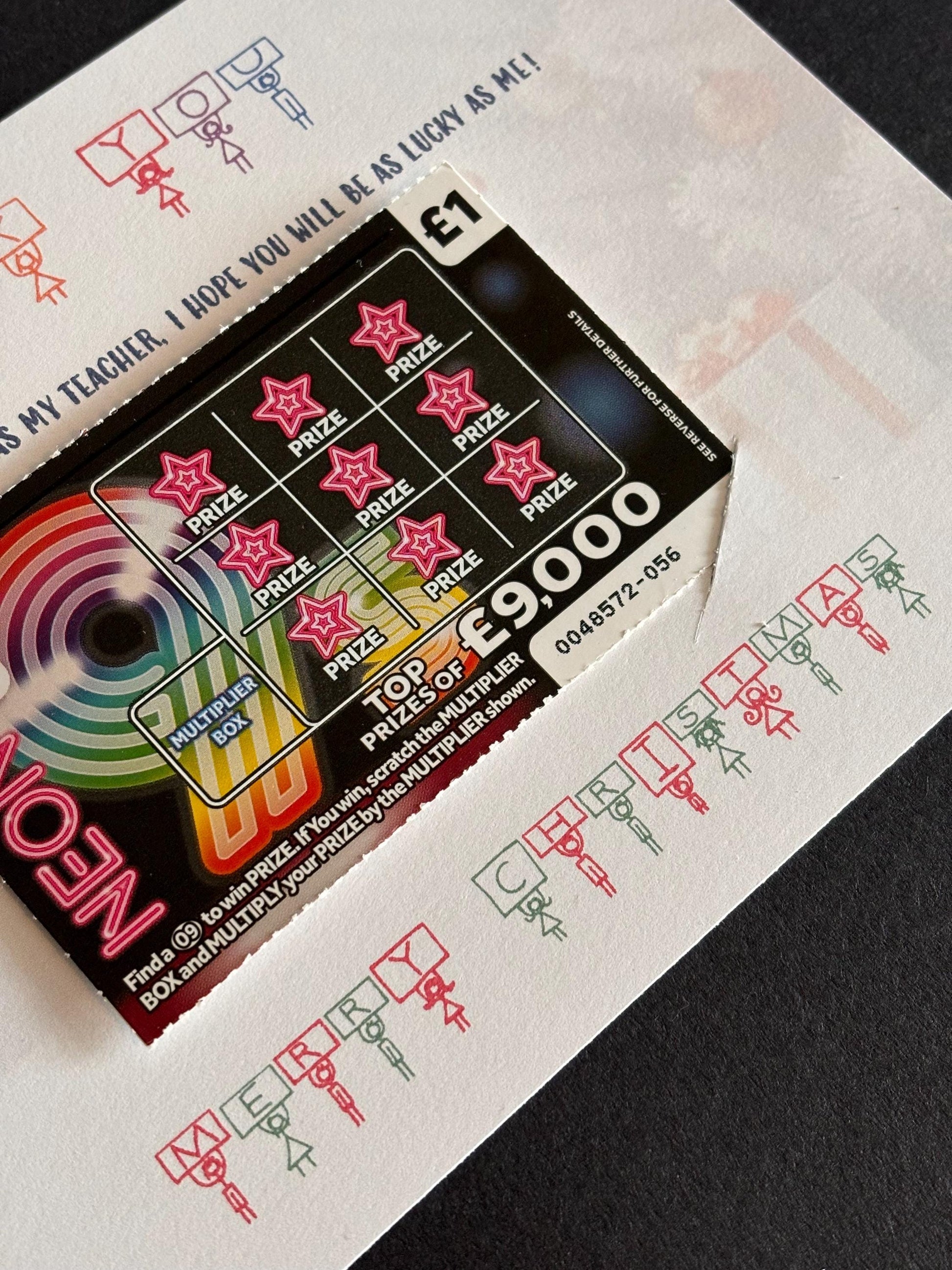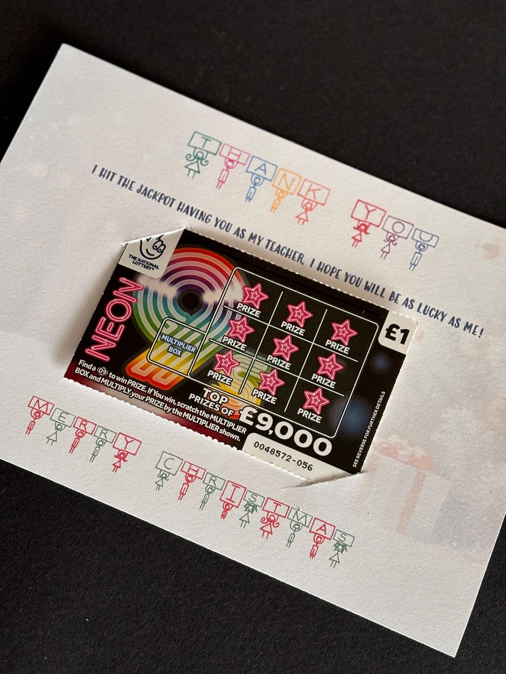 Each card comes with a £1 scratchcard attached, adding a playful twist that could make your teacher feel even luckier this holiday season. It's a simple yet meaningful gesture to show your appreciation and spread some Christmas cheer.