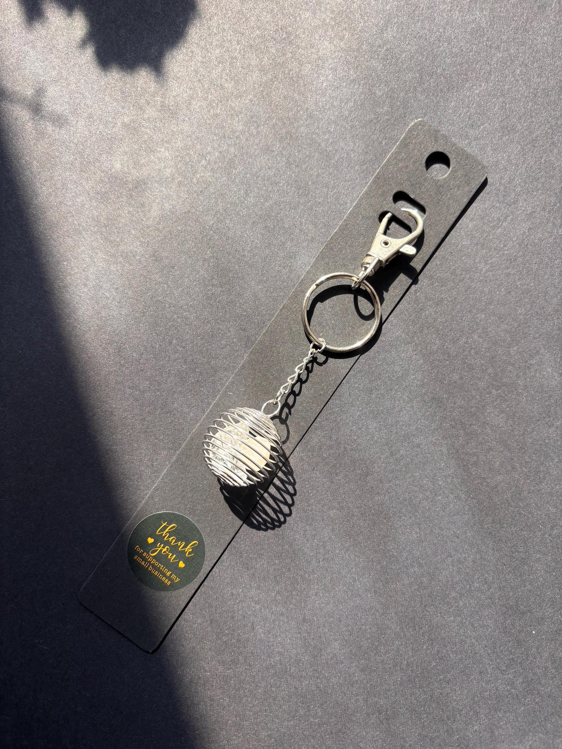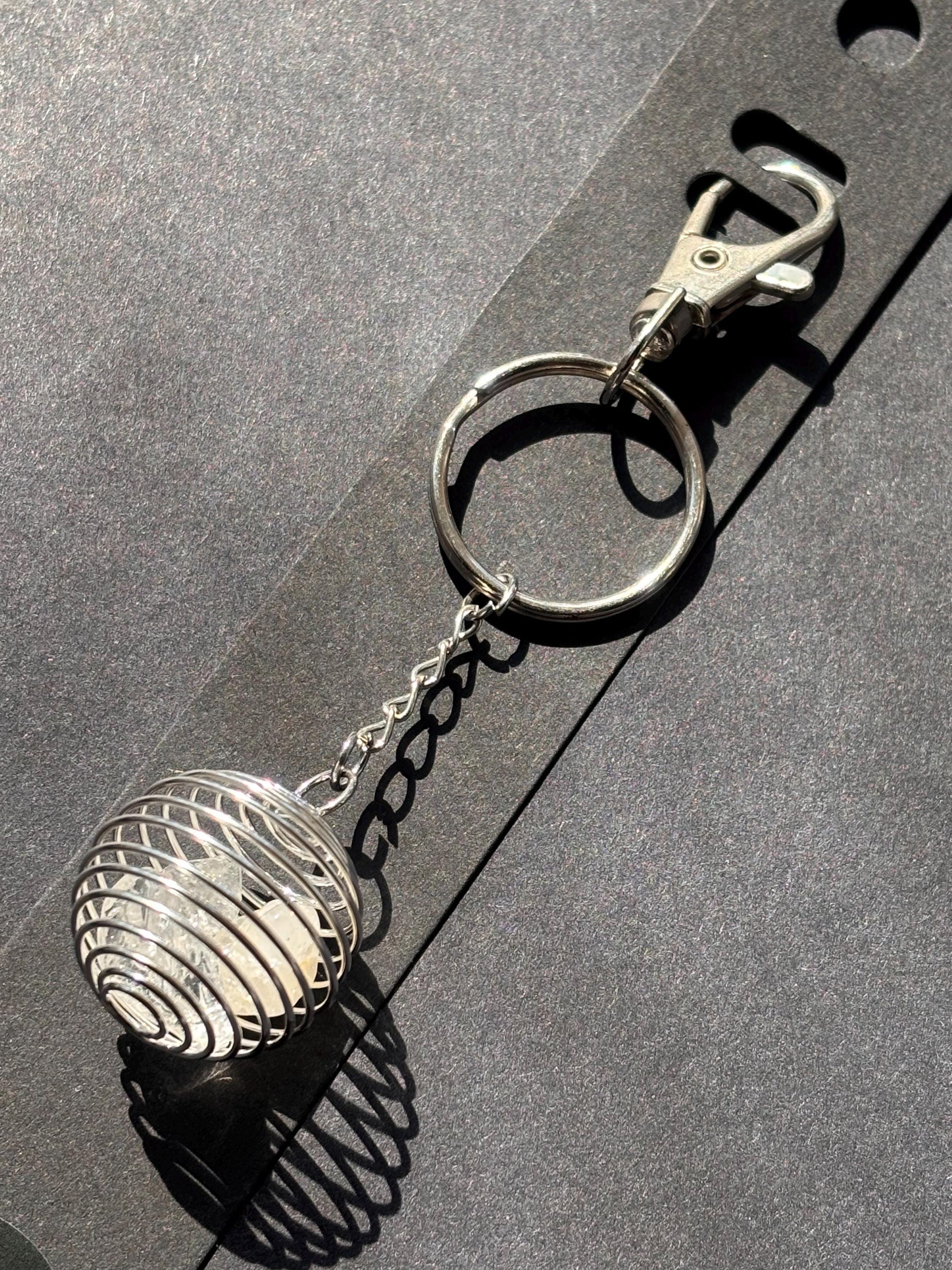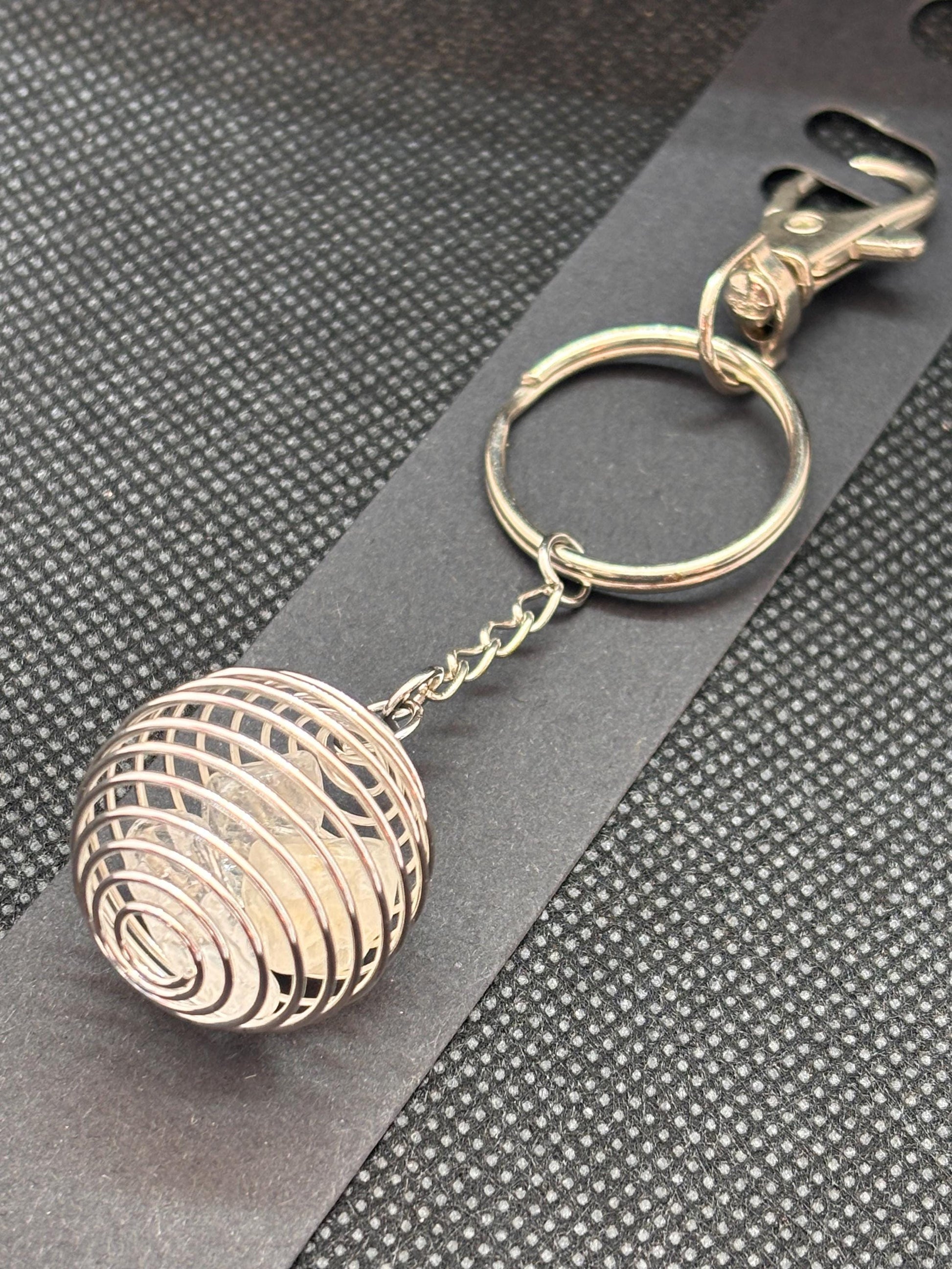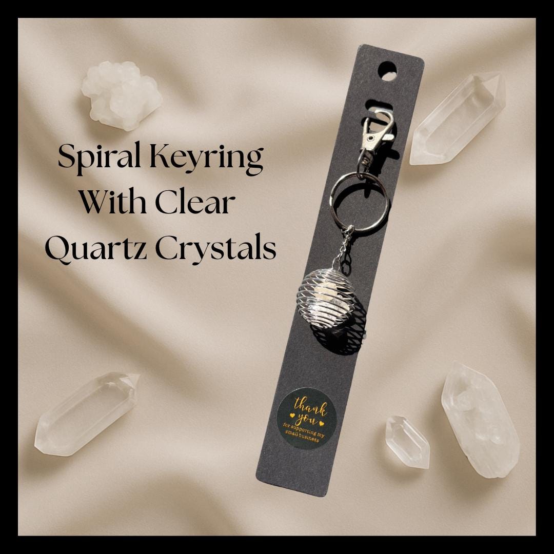 Carry calming energy and mental clarity wherever you go with this beautiful Clear Quartz Spiral Keyring. Featuring 3 raw Clear Quartz crystals encased in a secure silver-tone spiral cage, this keyring is not only stylish but also a powerful tool for energy balancing and healing.