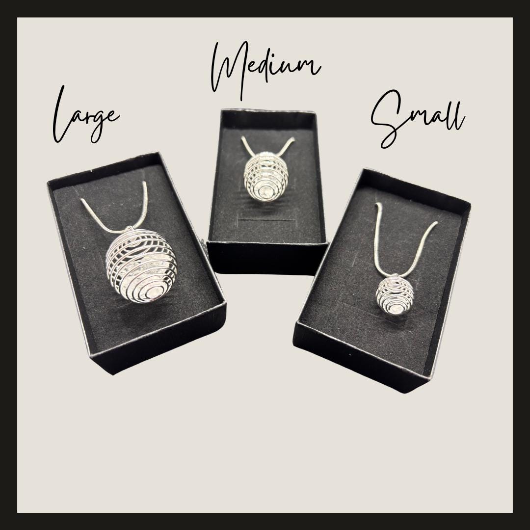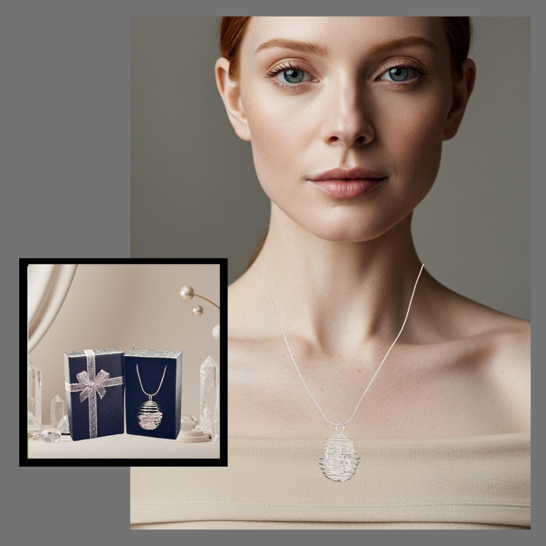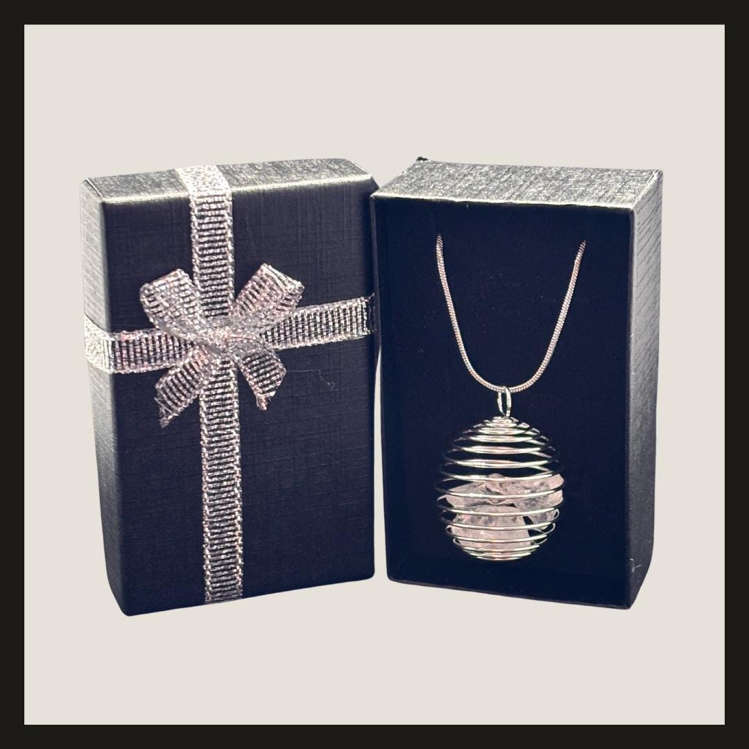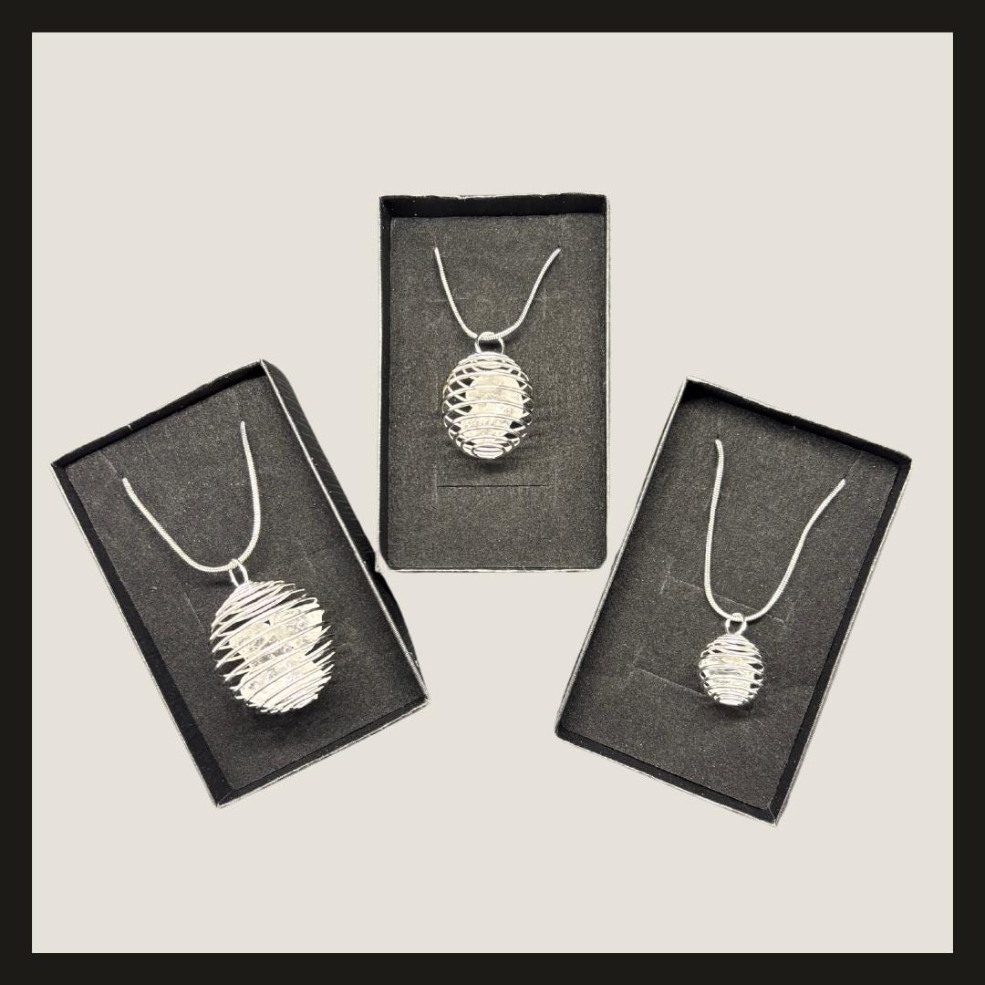 Timeless, elegant, and full of meaning – this 925 silver plated spiral cage necklace showcases stunning clear quartz crystals inside a unique wire-wrapped pendant. Available in three sizes, each pendant holds a different number of natural quartz points, making it a meaningful gift or personal talisman.