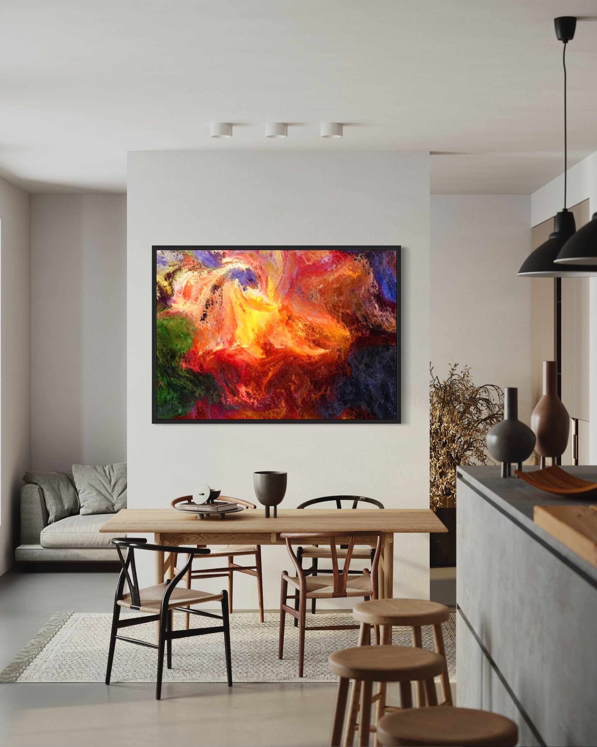 Hang this artwork in your living room, and watch as it becomes the centrepiece of conversation. Its vibrant presence effortlessly enlivens the atmosphere, making a bold statement about your individuality and appreciation for artistic expression. Let it be a conversation starter, sparking dialogues about the power of colour and the boundless possibilities of abstract art.