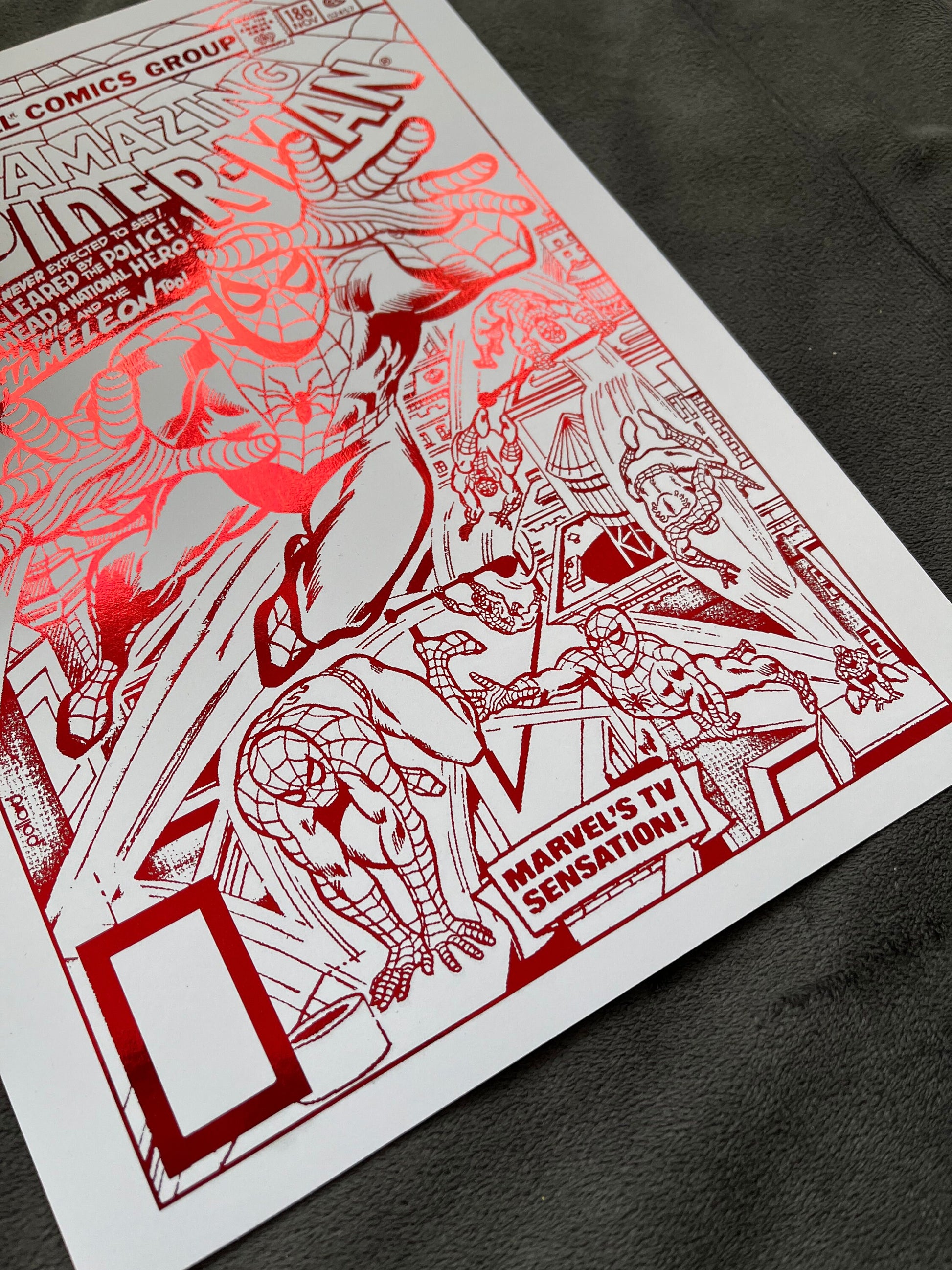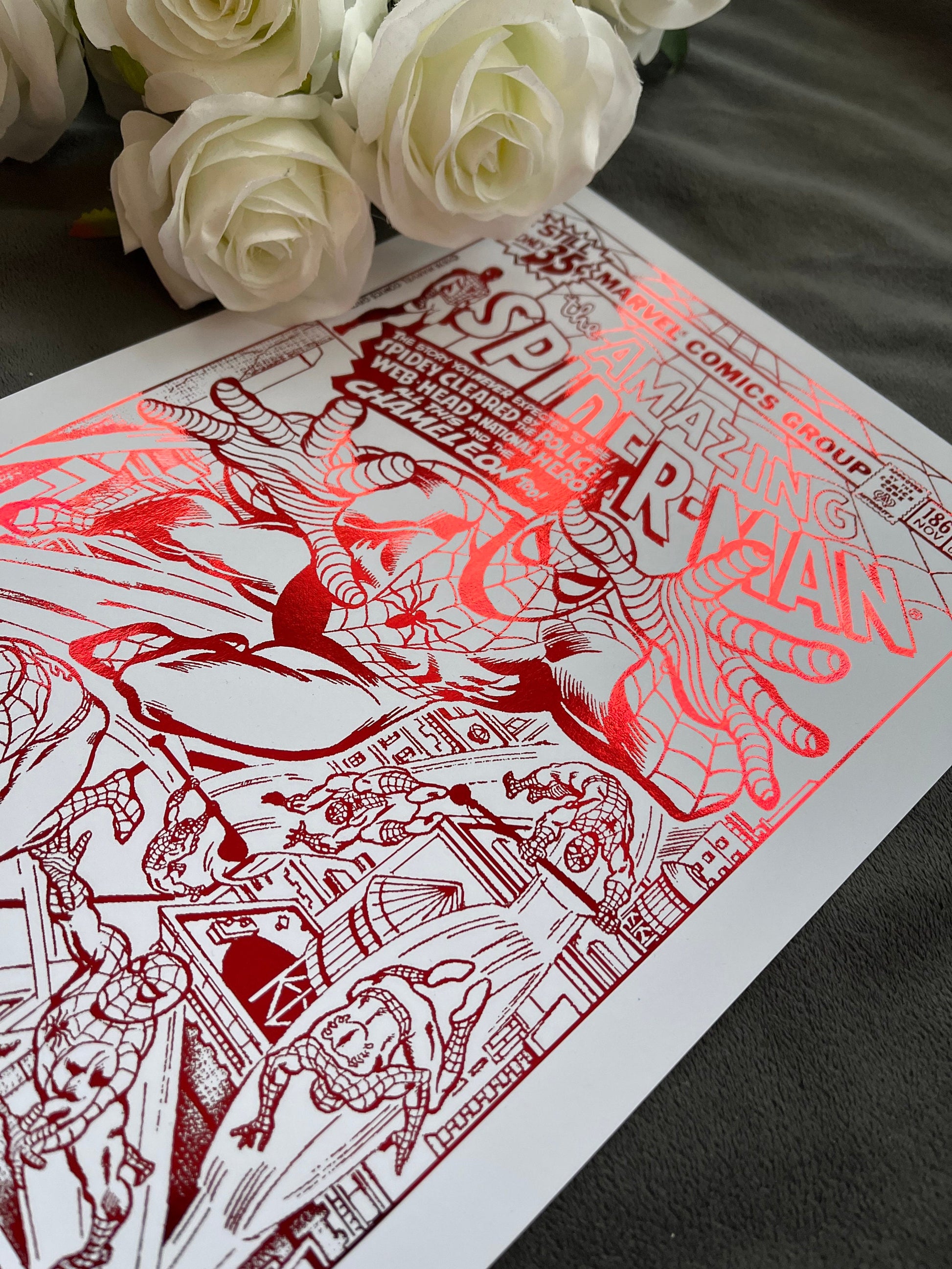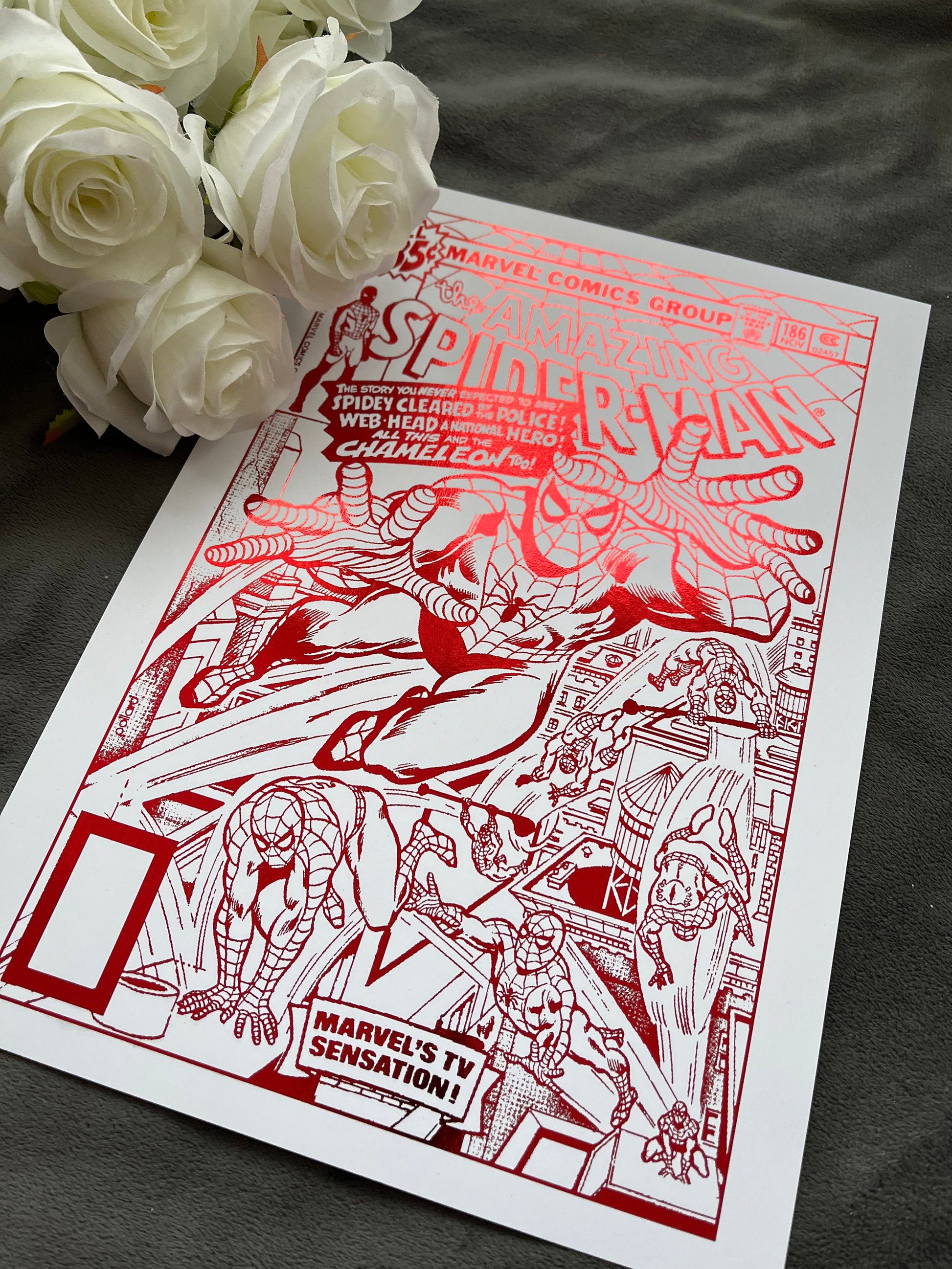 Bring some superhero style to your wall decor with this Spider-Man 186 foil print. Featuring a bold and bright depiction of Spider-Man in action, this print is sure to be a hit with fans of the iconic Marvel Comics character. The foil print adds a metallic finish that catches the light, making it stand out on your wall. This print is made on high-quality cardstock and comes in A5 and A4 sizes, making it easy to frame and display in any room. Whether you’re a die-hard Spider-Man fan or just looking to add some pop culture flair to your home, this foil print is a must-have.