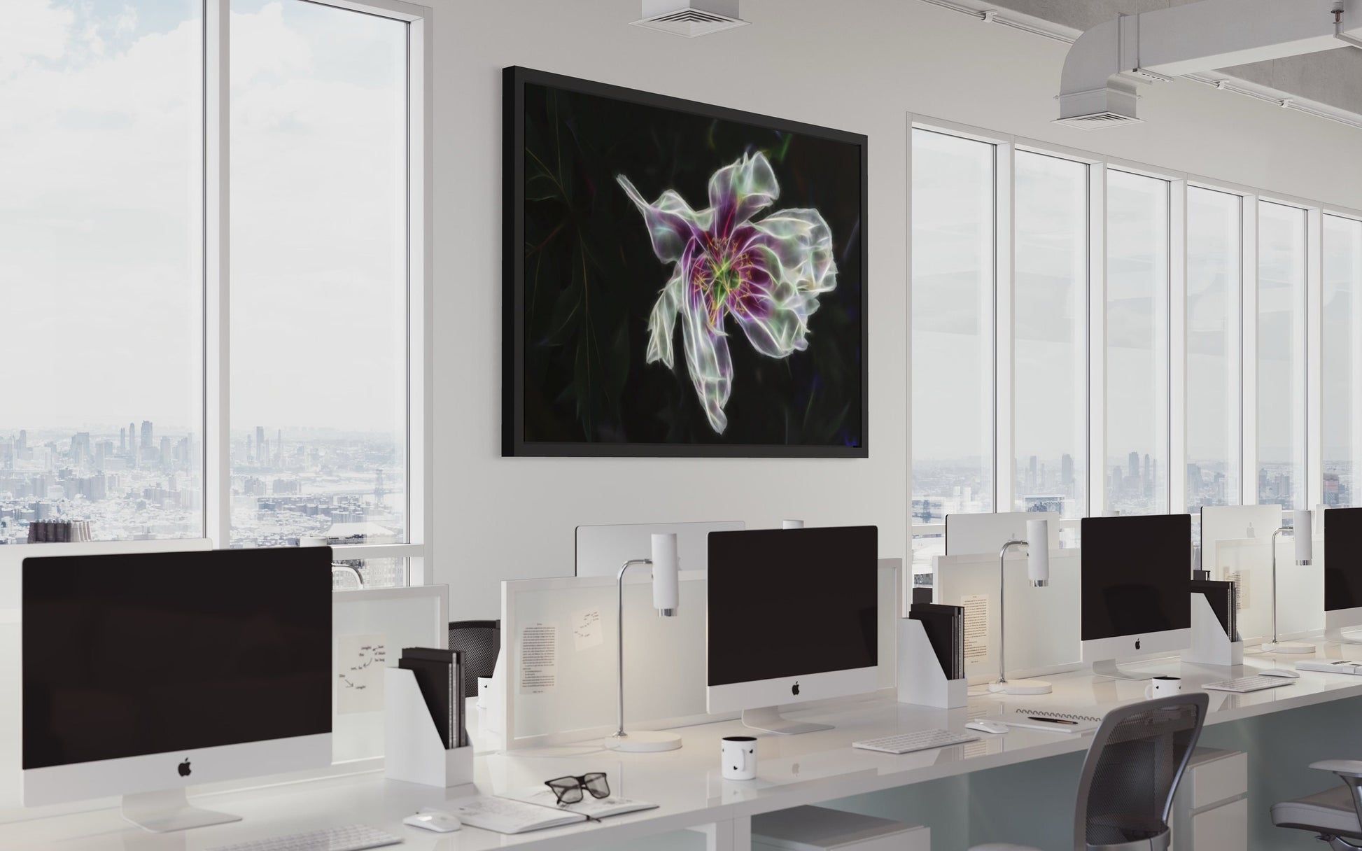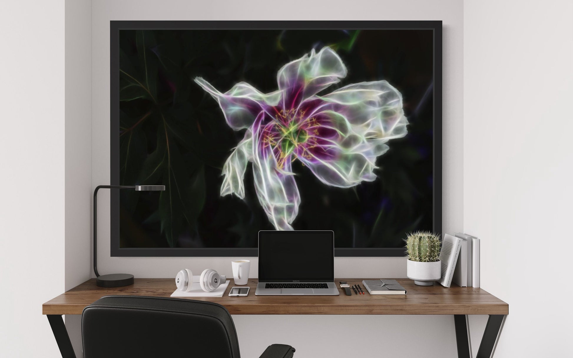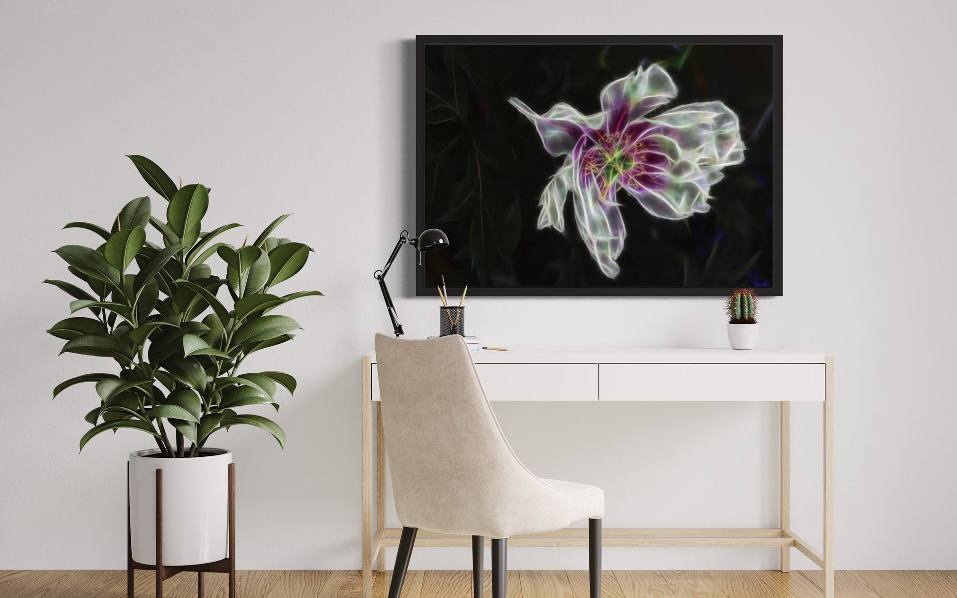 Experience the harmonious blend of nature and technology with our mesmerising floral print. This captivating artwork showcases a stunning flower that appears to be intricately composed of vibrant, electrifying currents, creating a visual masterpiece that pushes the boundaries of artistic imagination.