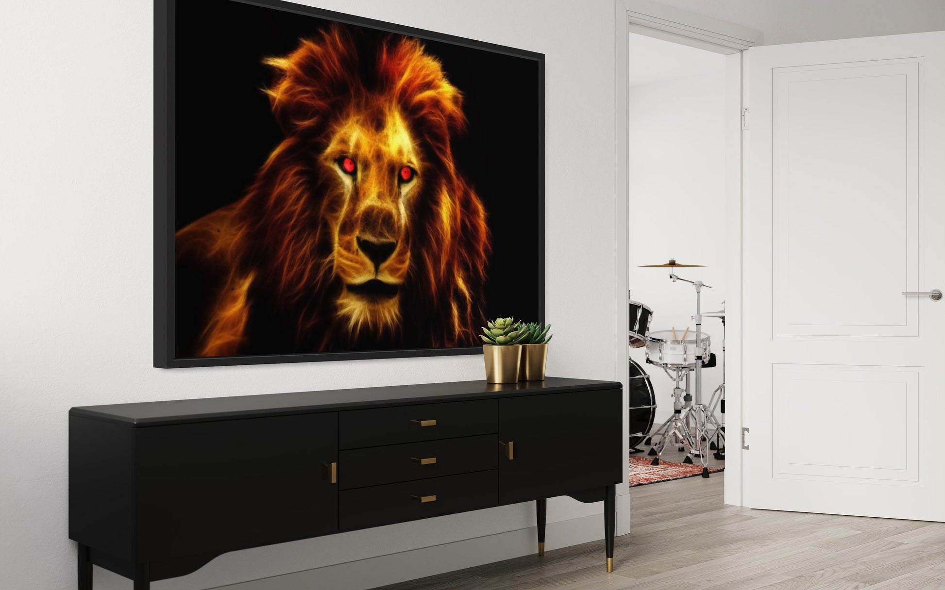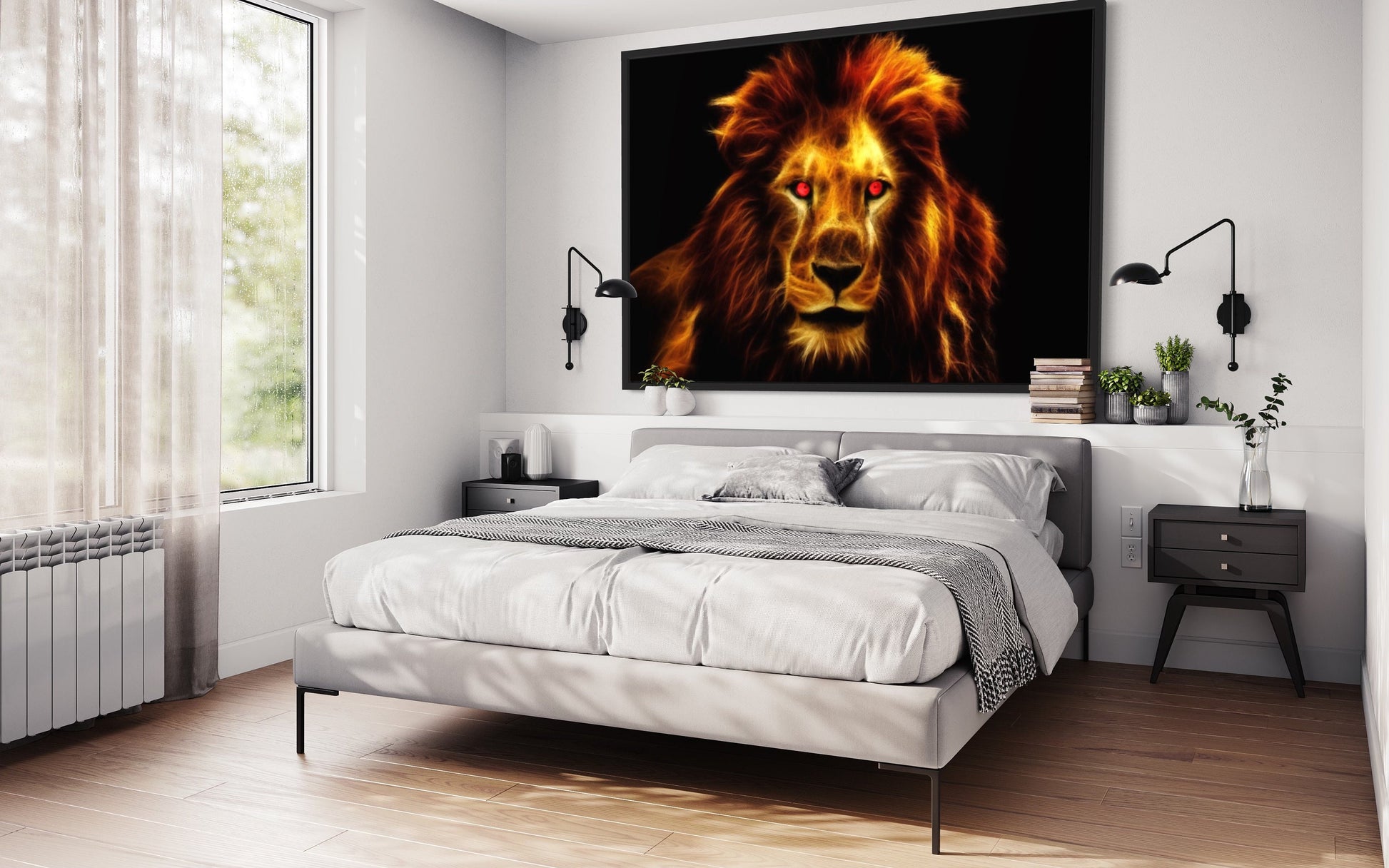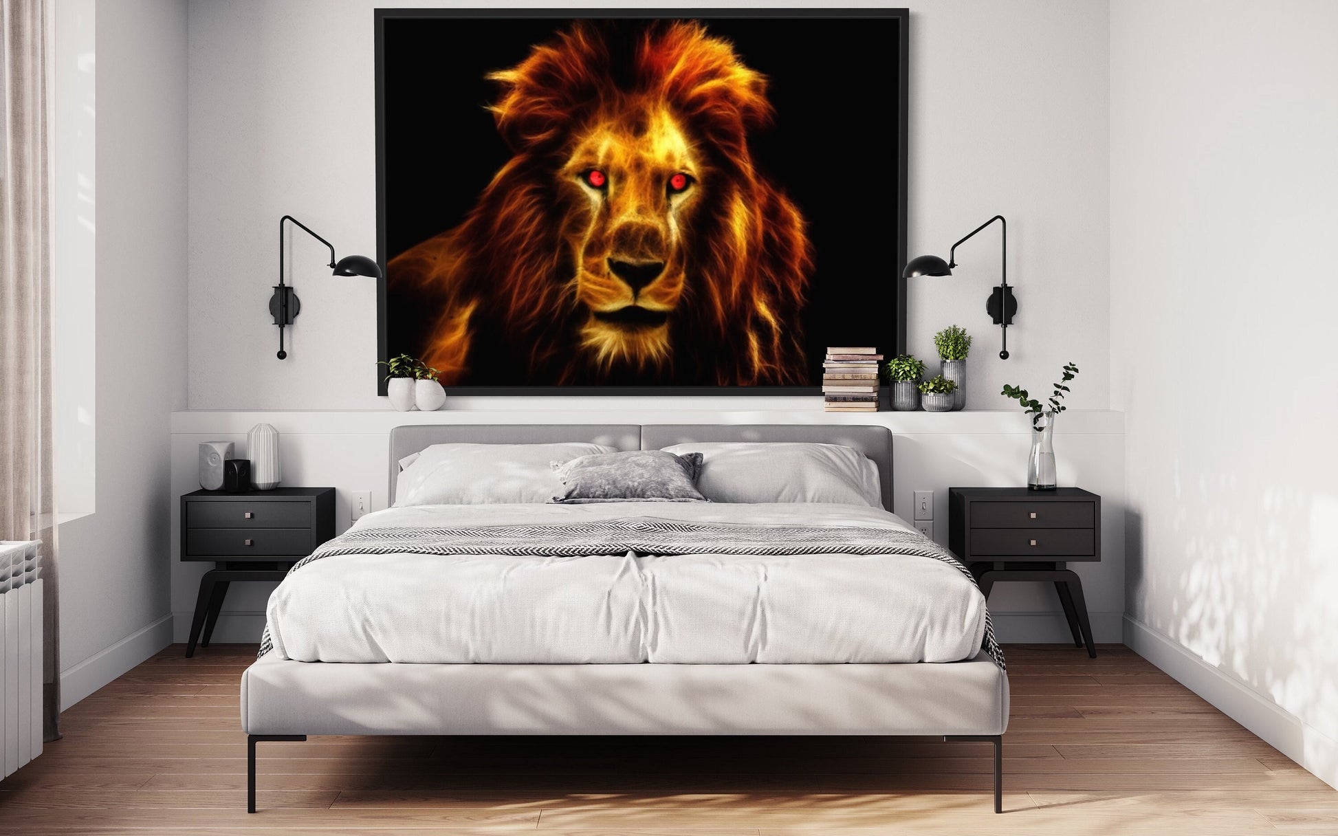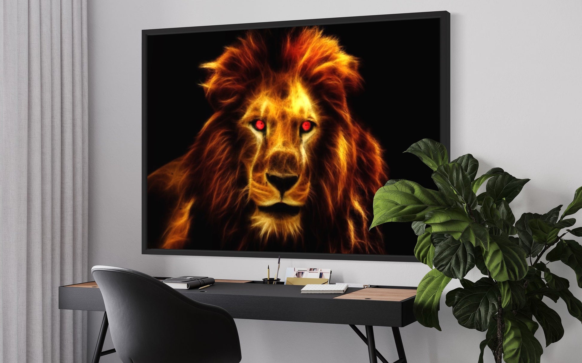 Each flame creates a mesmerising spectacle, evoking the untamed energy and captivating allure of this regal creature. The lion's piercing eyes, red with determination and power, lock gazes with the viewer, drawing you into a realm where the elemental forces of nature converge.