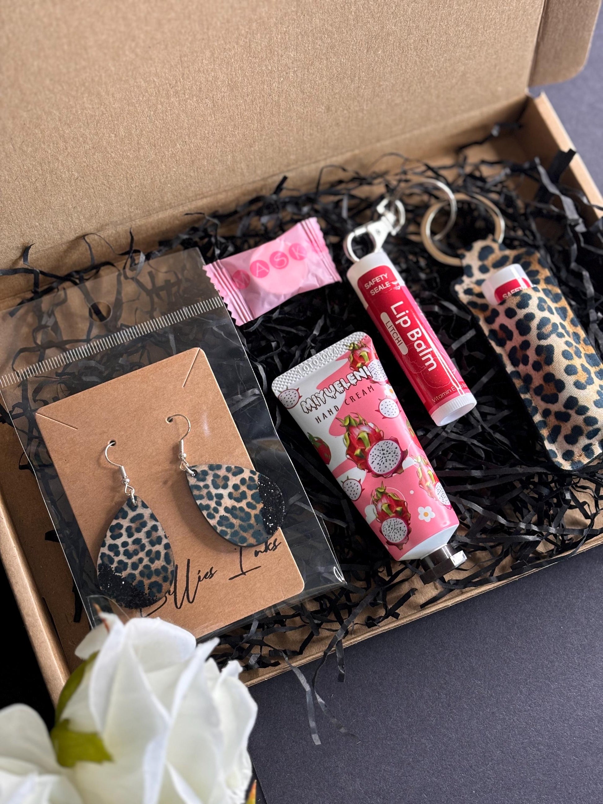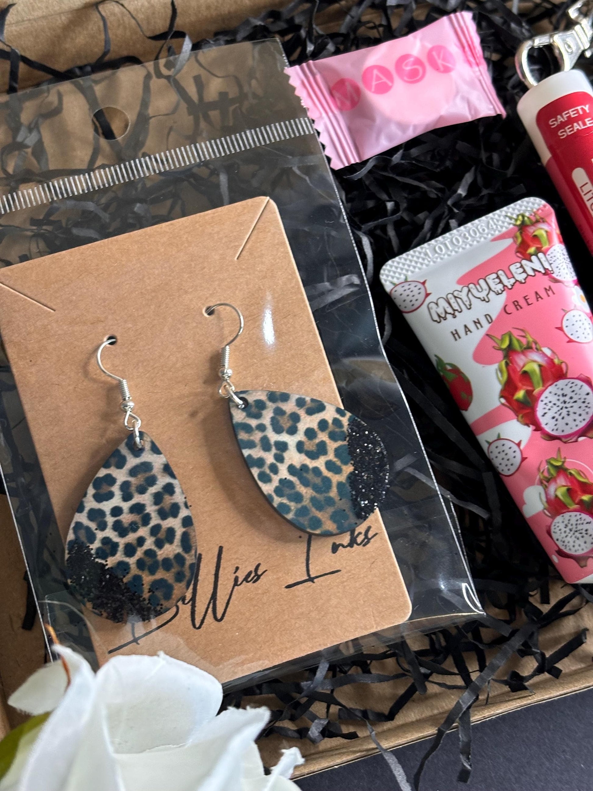 Glitter Top Leopard Print Gift Set – Stylish Oval Earrings, Lipstick Holder & Skincare Essentials