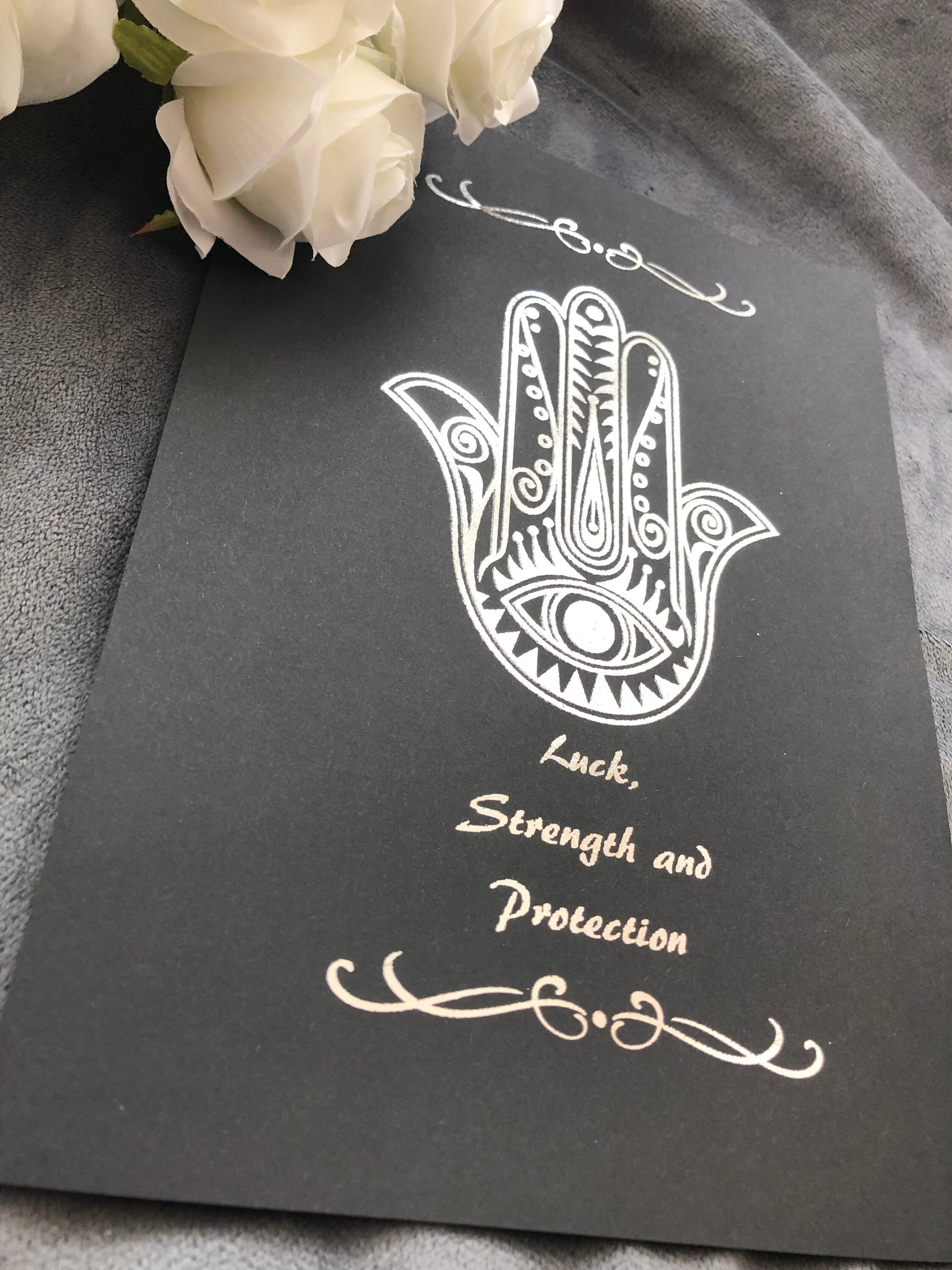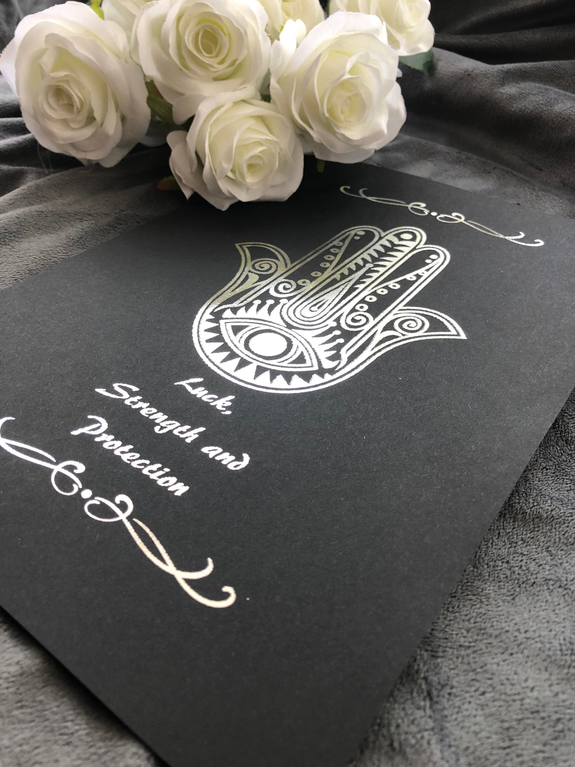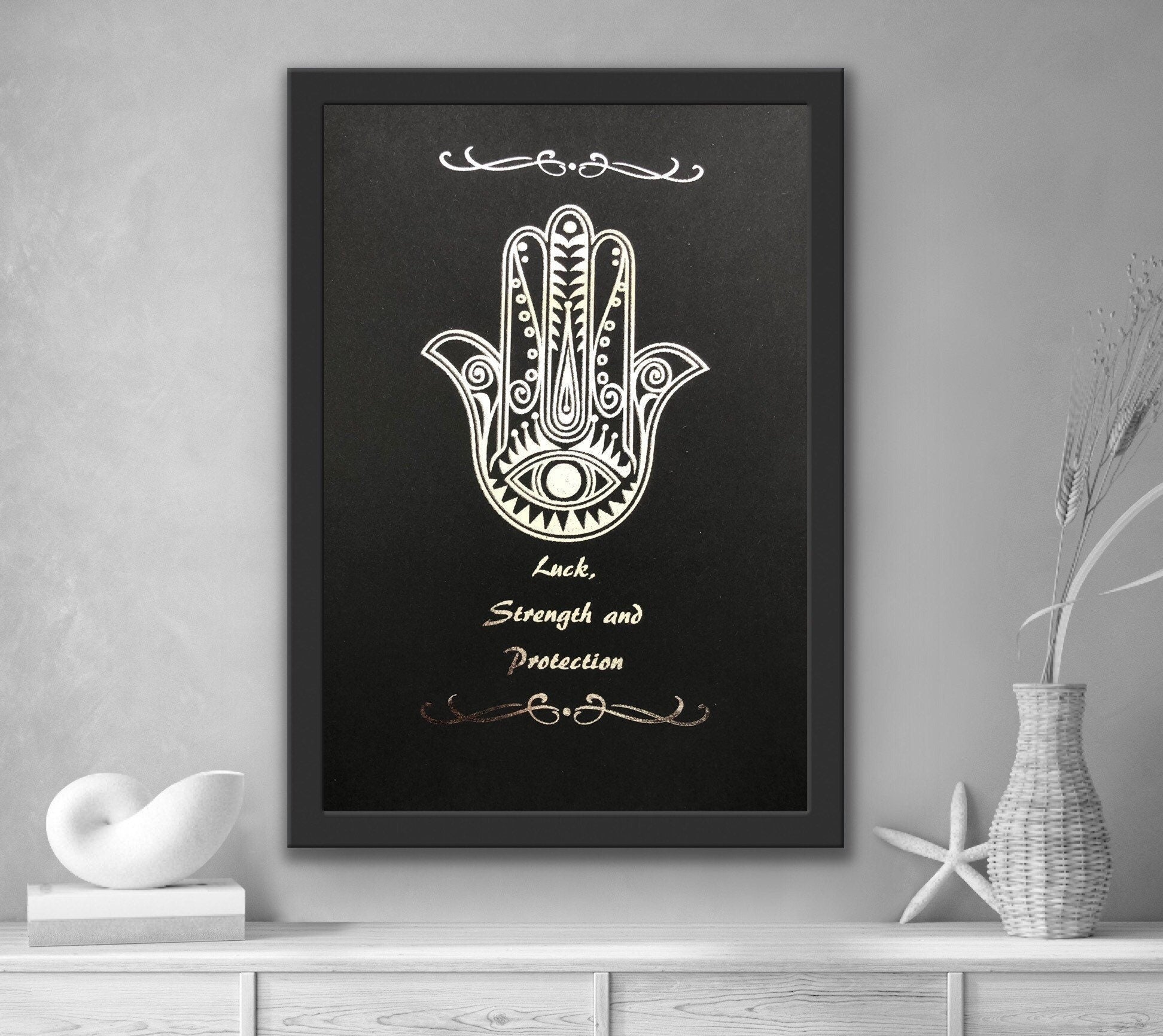 A stunning and protective piece of art that combines the ancient symbolism of the Hamsa hand with the mystical allure of the Evil Eye. This exclusive print features an intricately designed Hamsa hand adorned with a captivating Evil Eye motif, beautifully rendered in shimmering foil accents.