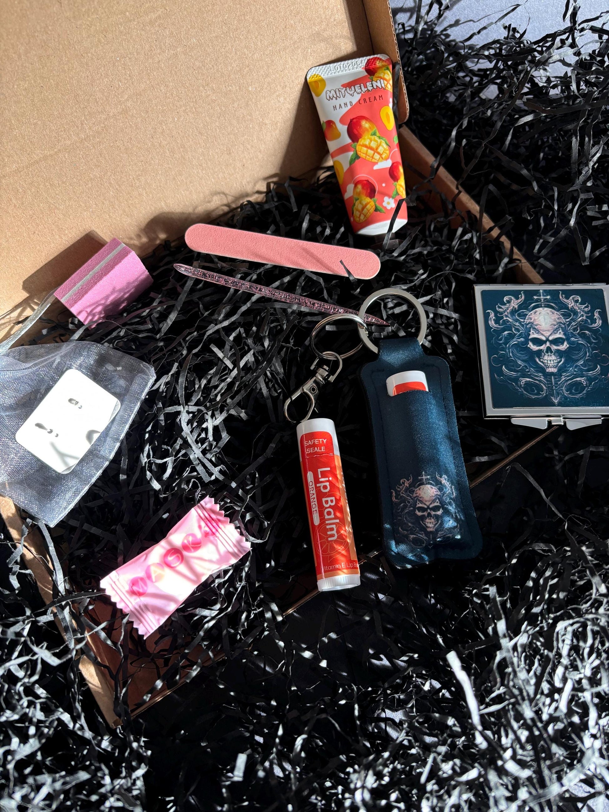 Looking for a gift that’s as functional as it is edgy? This Handbag Essentials Gift Set with a black skull design is the perfect blend of style and self-care. Inside, you’ll find everything you need for on-the-go beauty: