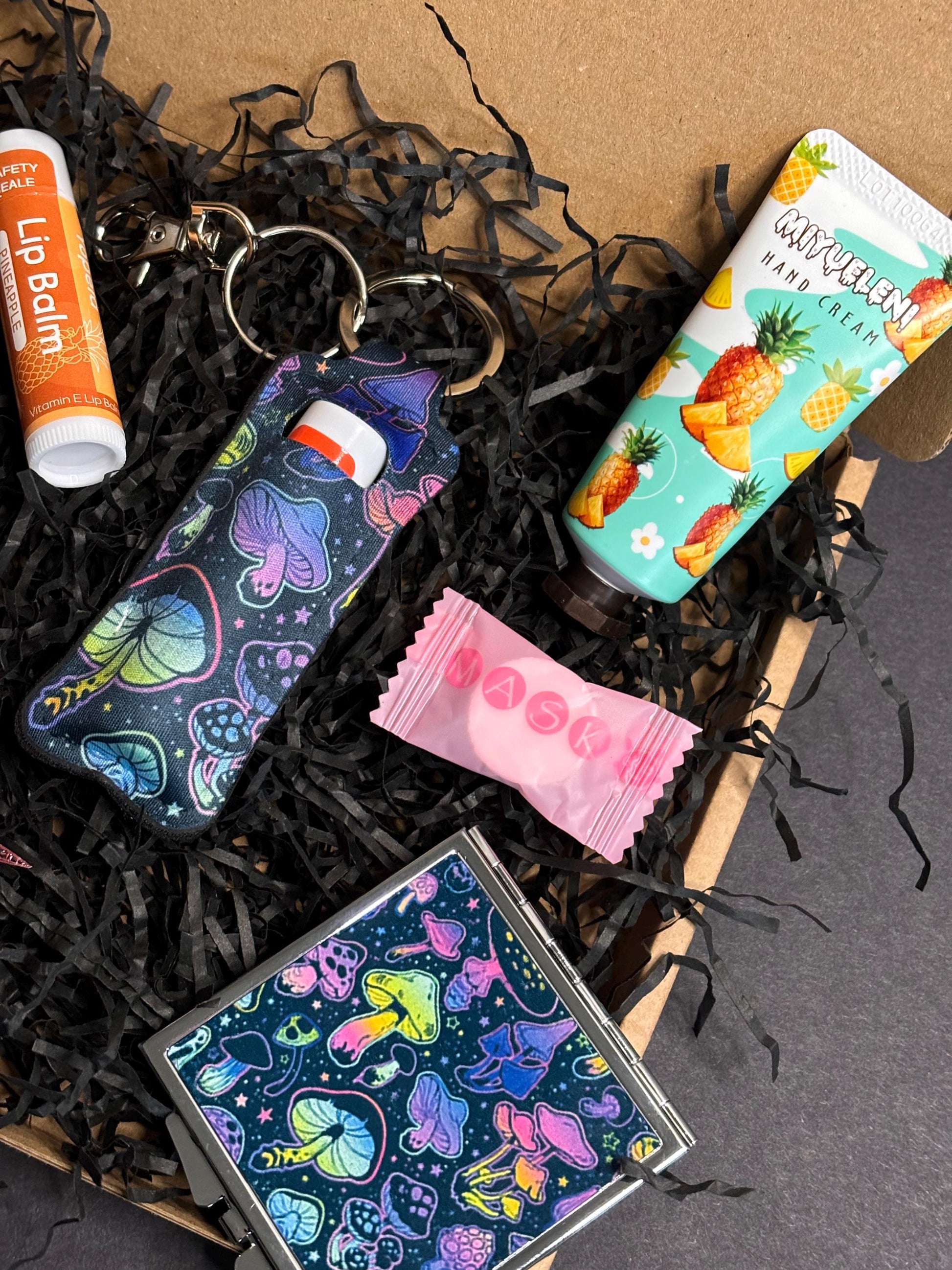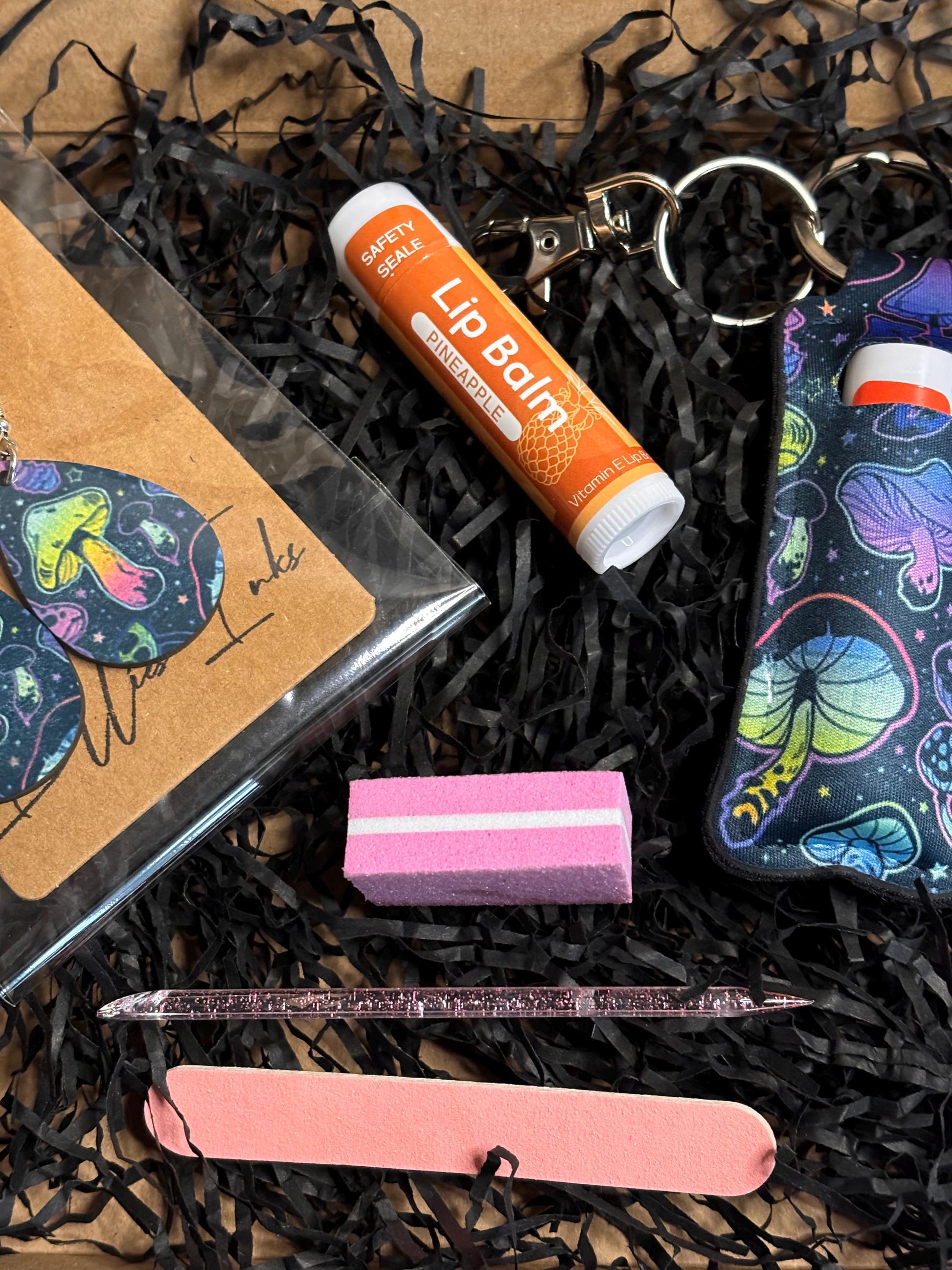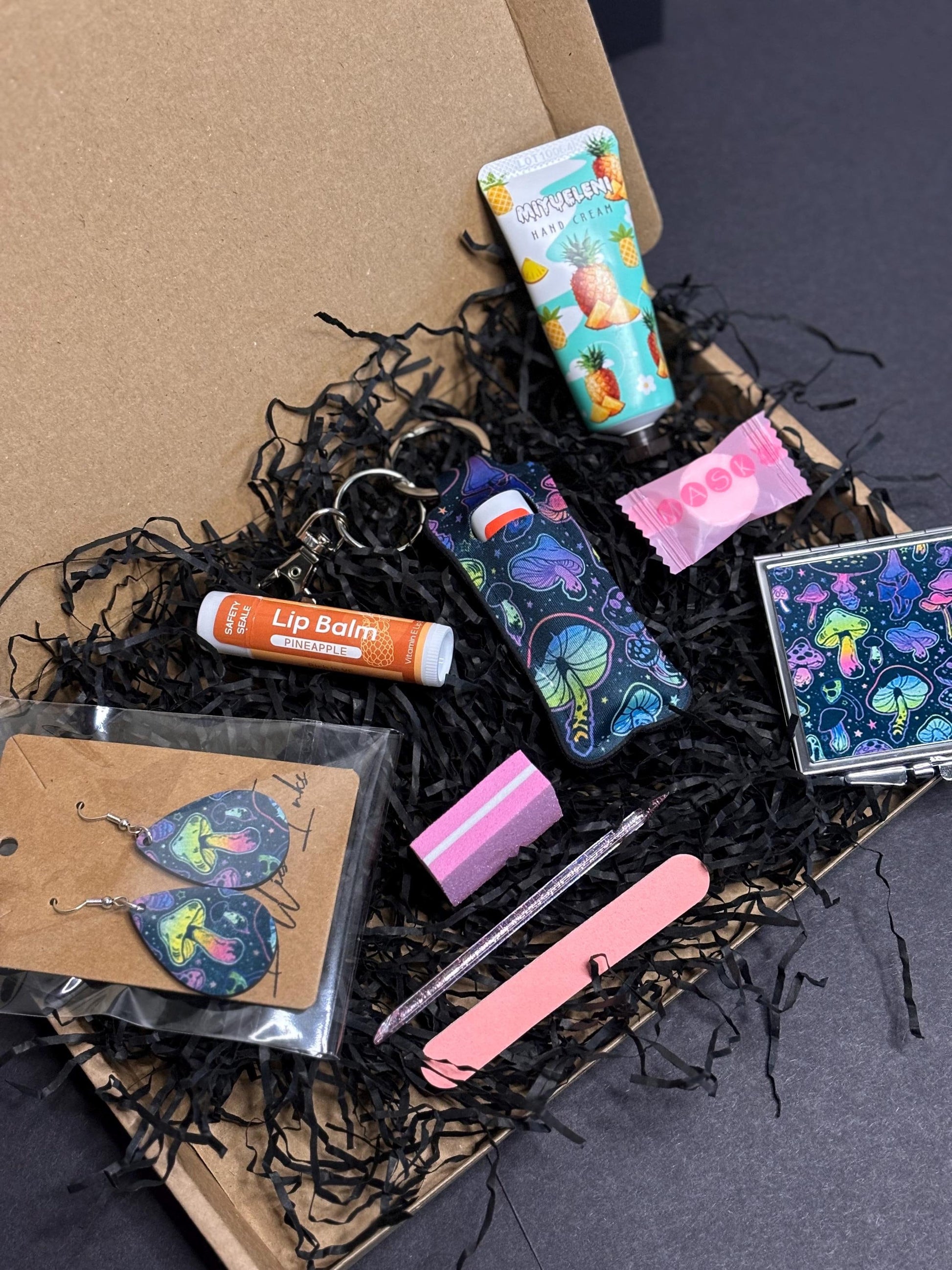 Raving Mushrooms Handbag Essentials Gift Set – Oval Earrings, Lipstick Holder, Mirror, Nail and Skincare Treats