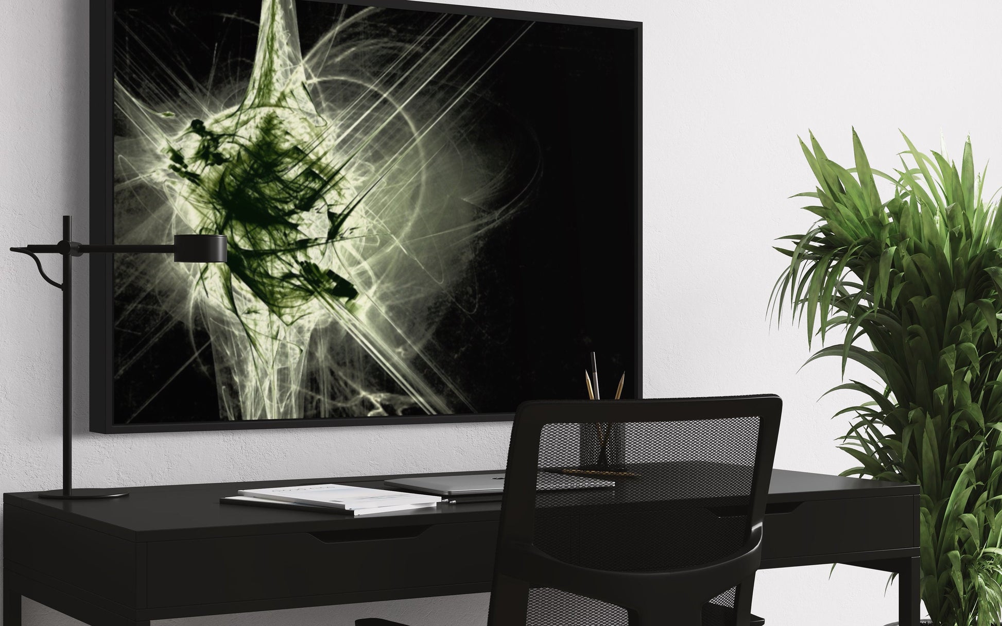 Inspired by the art of long exposure photography, this print seamlessly blends the fluidity of movement with the interplay of vibrant colours. The dynamic contrast between the deep black background and the vivid green and white lights creates a captivating composition that is both mesmerising and visually engaging.