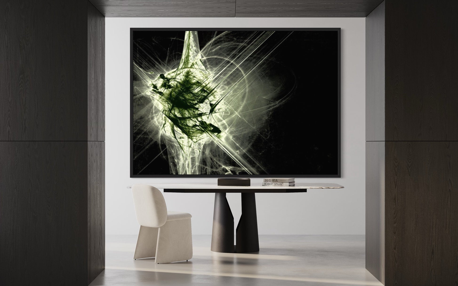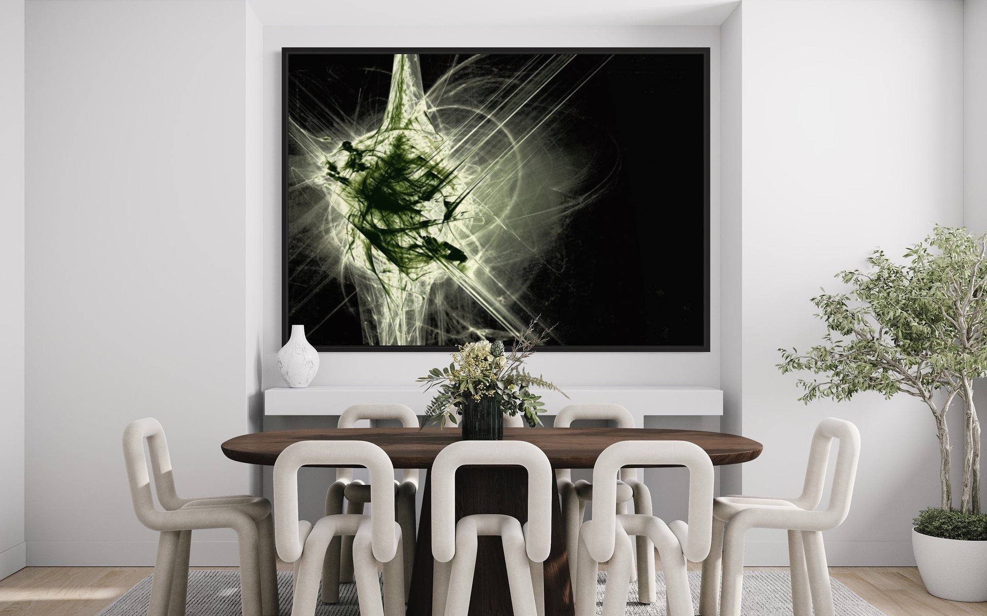 This extraordinary print showcases a captivating scene with a black background adorned by enchanting green and white lights on the left-hand side, creating a visual spectacle that exudes elegance and intrigue.