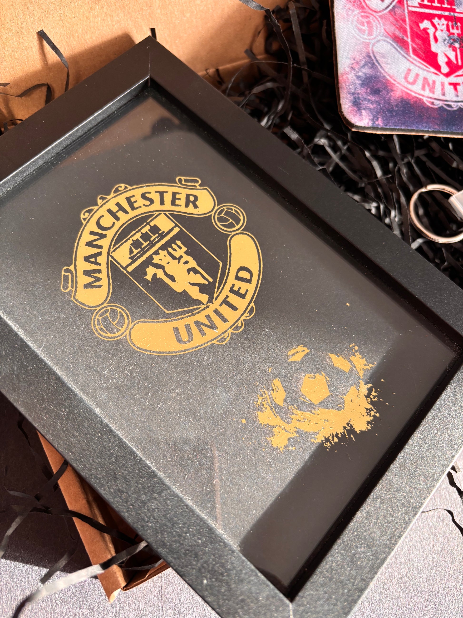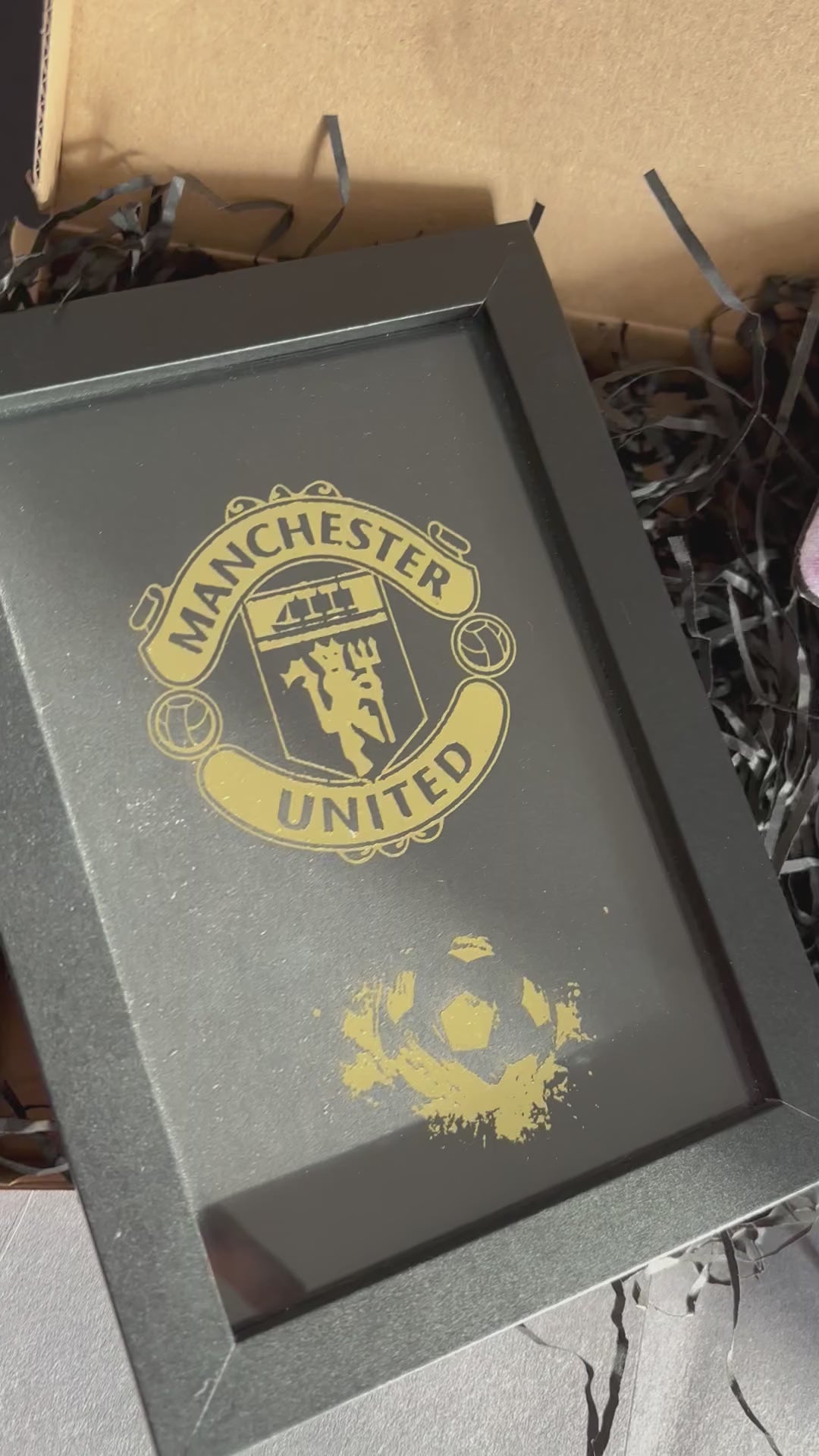 Framed Black and Gold Foil Manchester United Logo Print (4x6): This sleek framed print features the iconic Manchester United crest in stunning black and gold foil. A stylish addition to any fan’s home or office décor.
