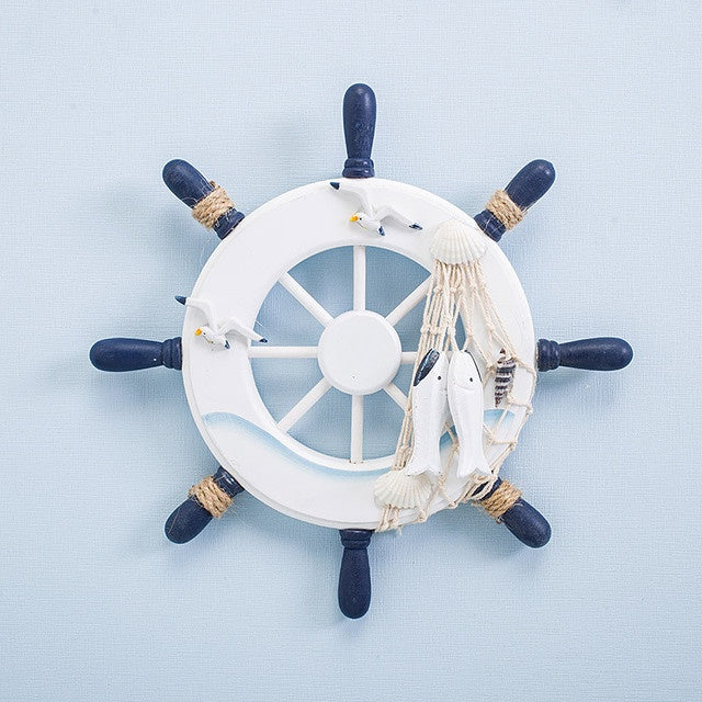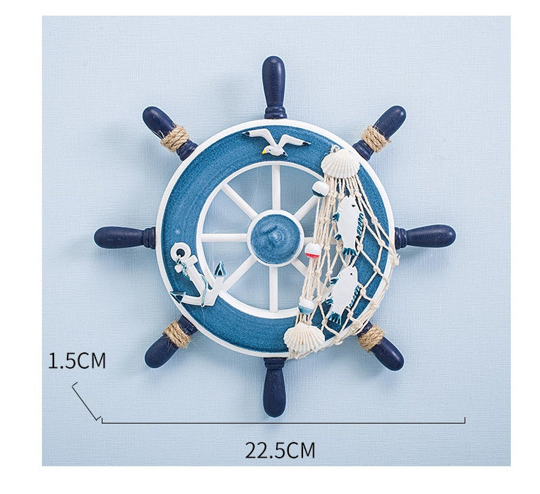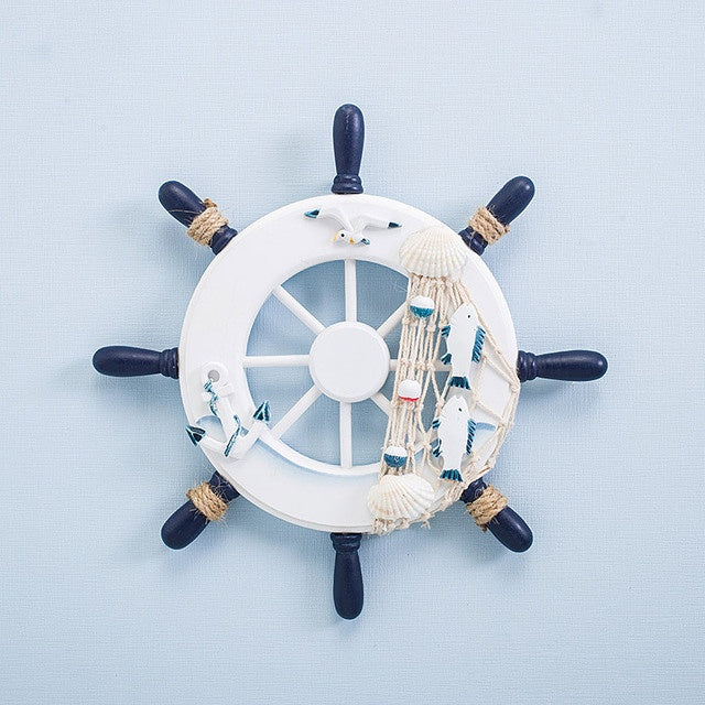 This wooden boat is rolled with fishing nets with some shells and ropes, making it a perfect nautical decoration to hang on the wall to highlight your home. Ideal for those who like boating and nautical art walls, this beach decoration will amaze your guests. This steering wheel has eight spokes painted in light blue and white around it and can be easily mounted on a wall that requires beach decoration.