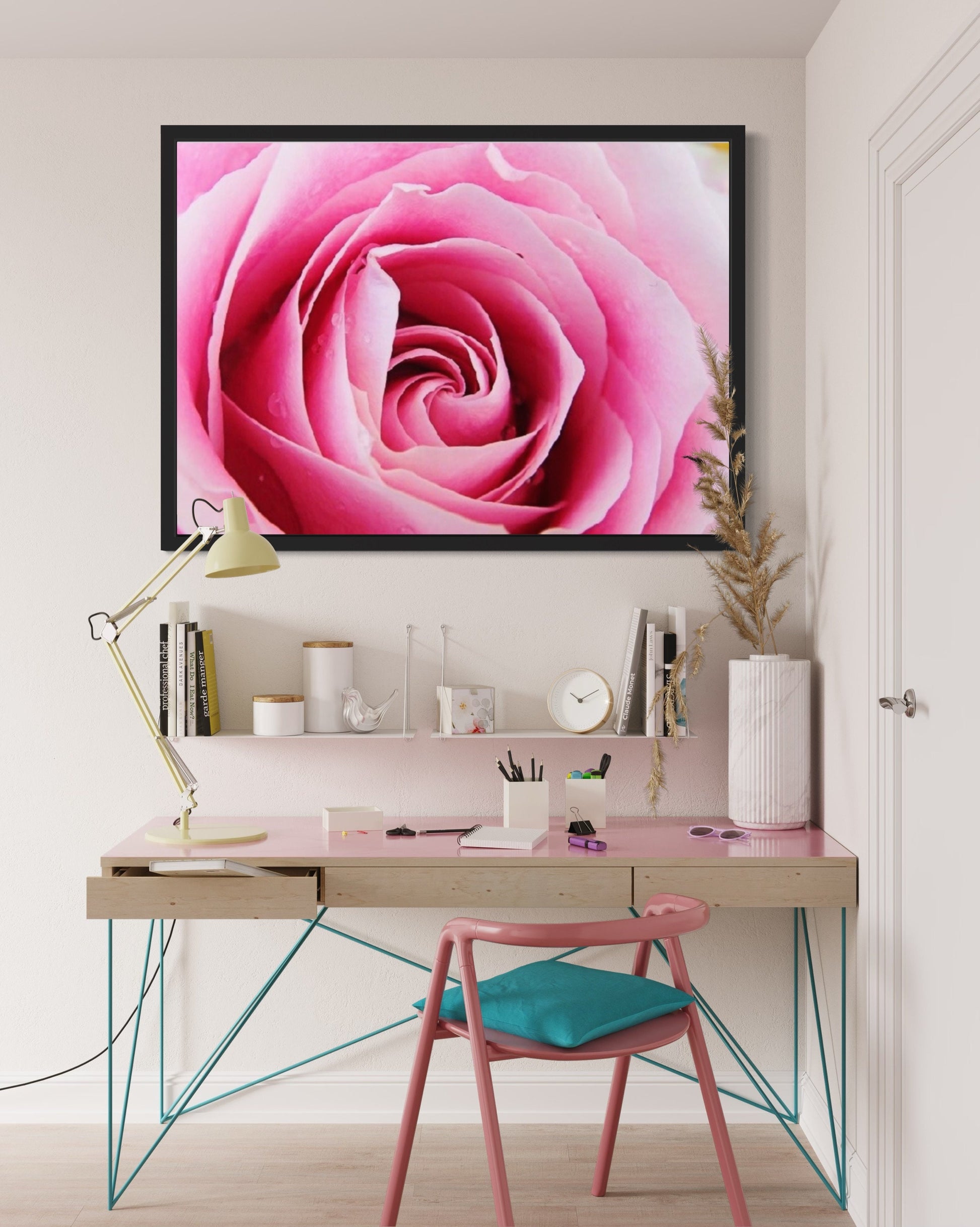 Indulge in the timeless elegance of our rose print, a stunning portrayal of a delicate pink rose captured in a mesmerising close-up. This exquisite artwork celebrates the inherent grace and charm of the rose, showcasing its velvety petals and captivating hues in all their glory.