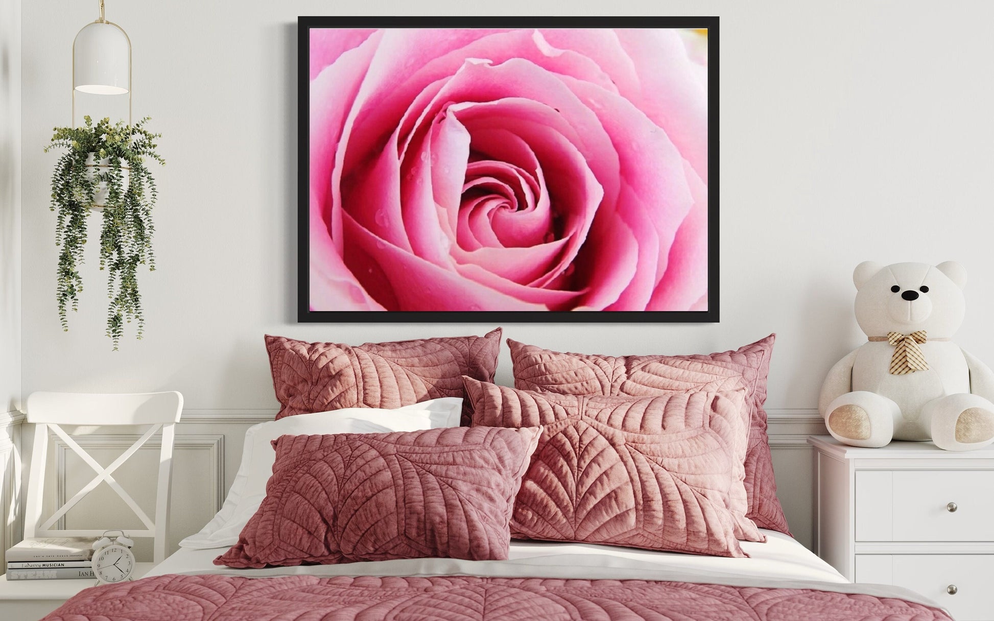Every detail of this close-up image has been meticulously preserved, ensuring that the intricate textures and subtle nuances of the pink rose are faithfully reproduced. From the delicate folds of each petal to the gentle gradation of colour, this high-resolution print brings the delicate beauty of the rose to life, offering an immersive and enchanting experience.