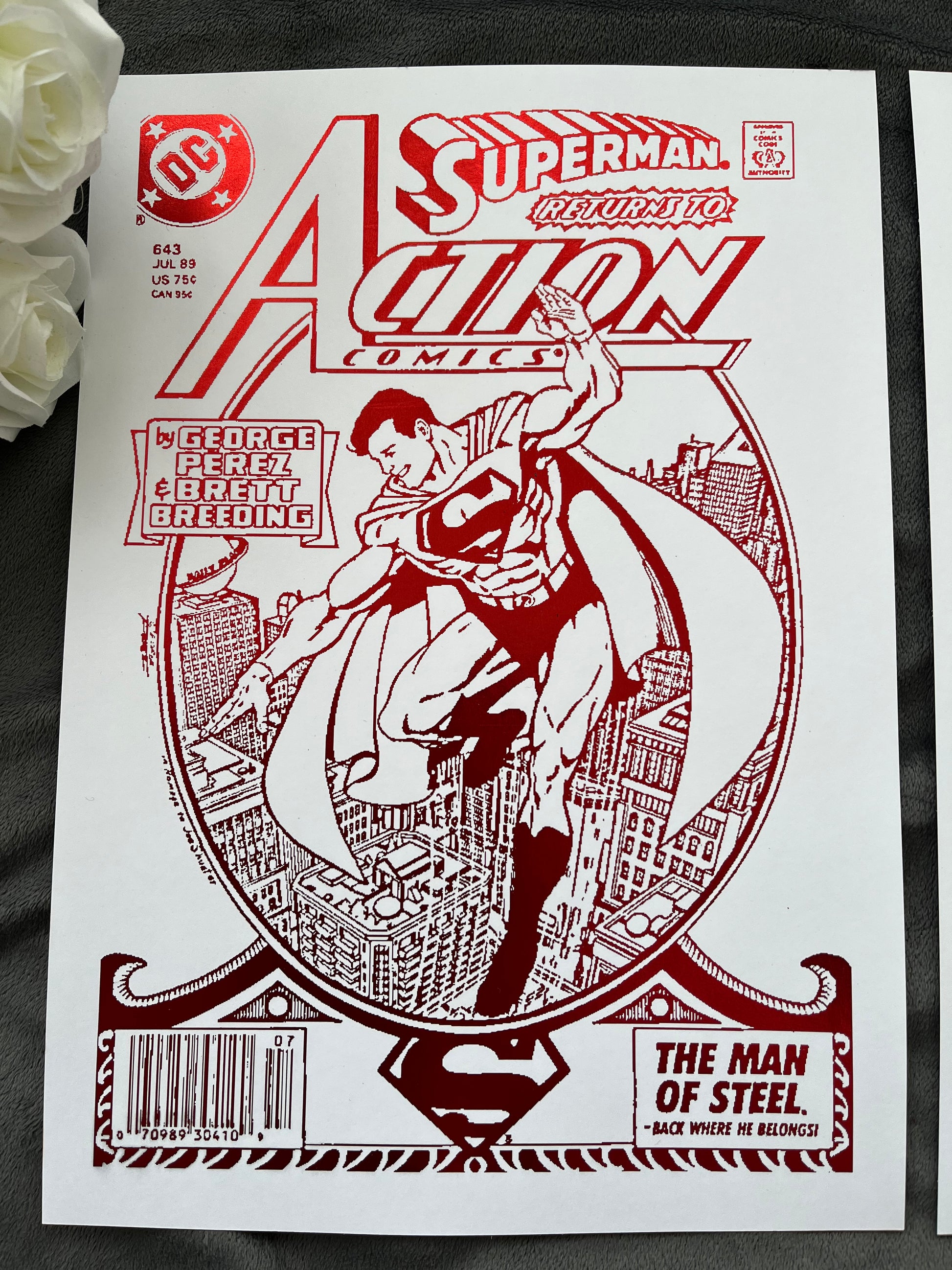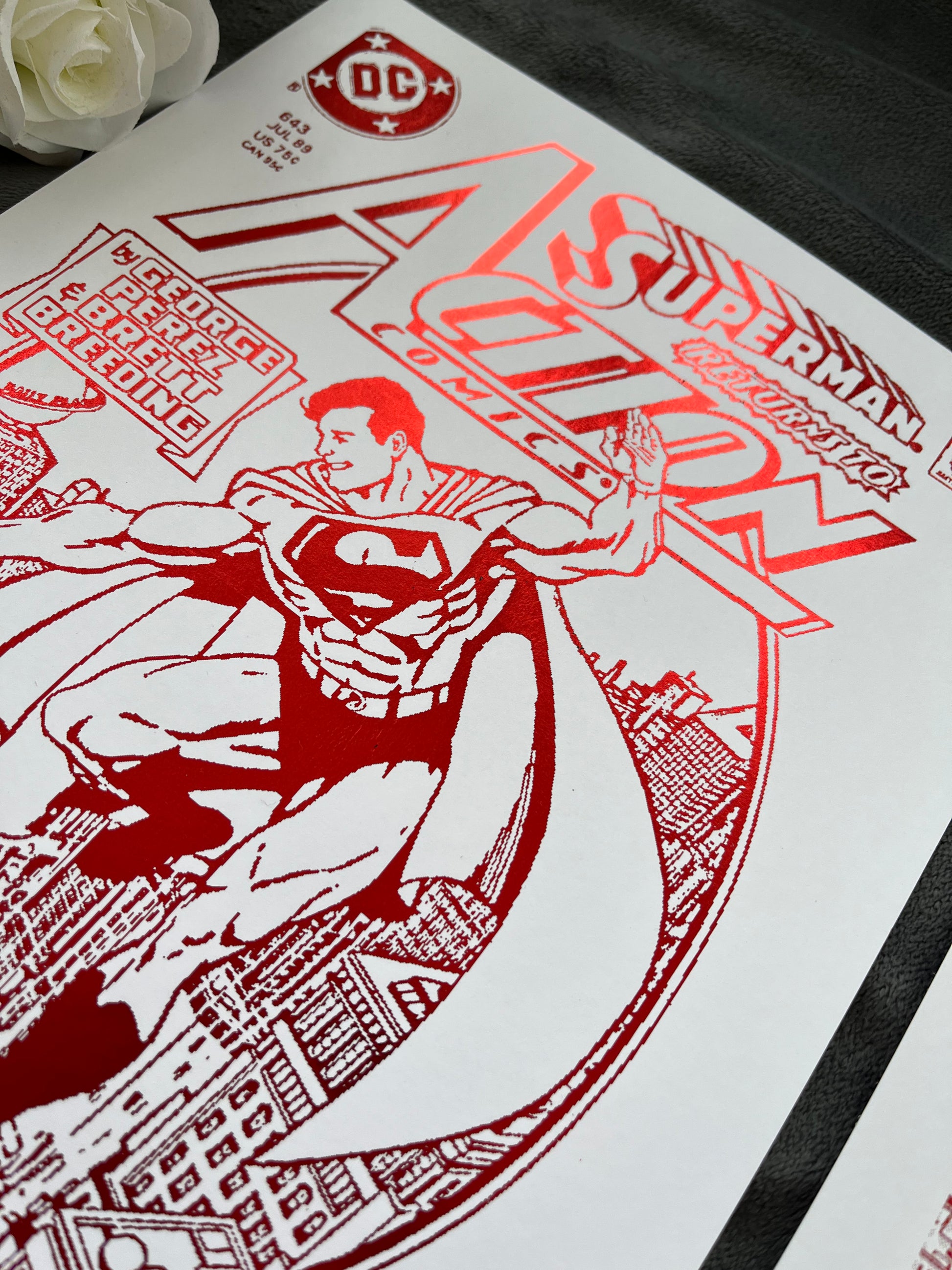 Each print is crafted with precision and meticulous attention to detail, ensuring that every aspect of Superman's character shines through. The use of red foil adds a sense of dynamic energy and grandeur, elevating these prints from mere collectibles to exquisite pieces of art.