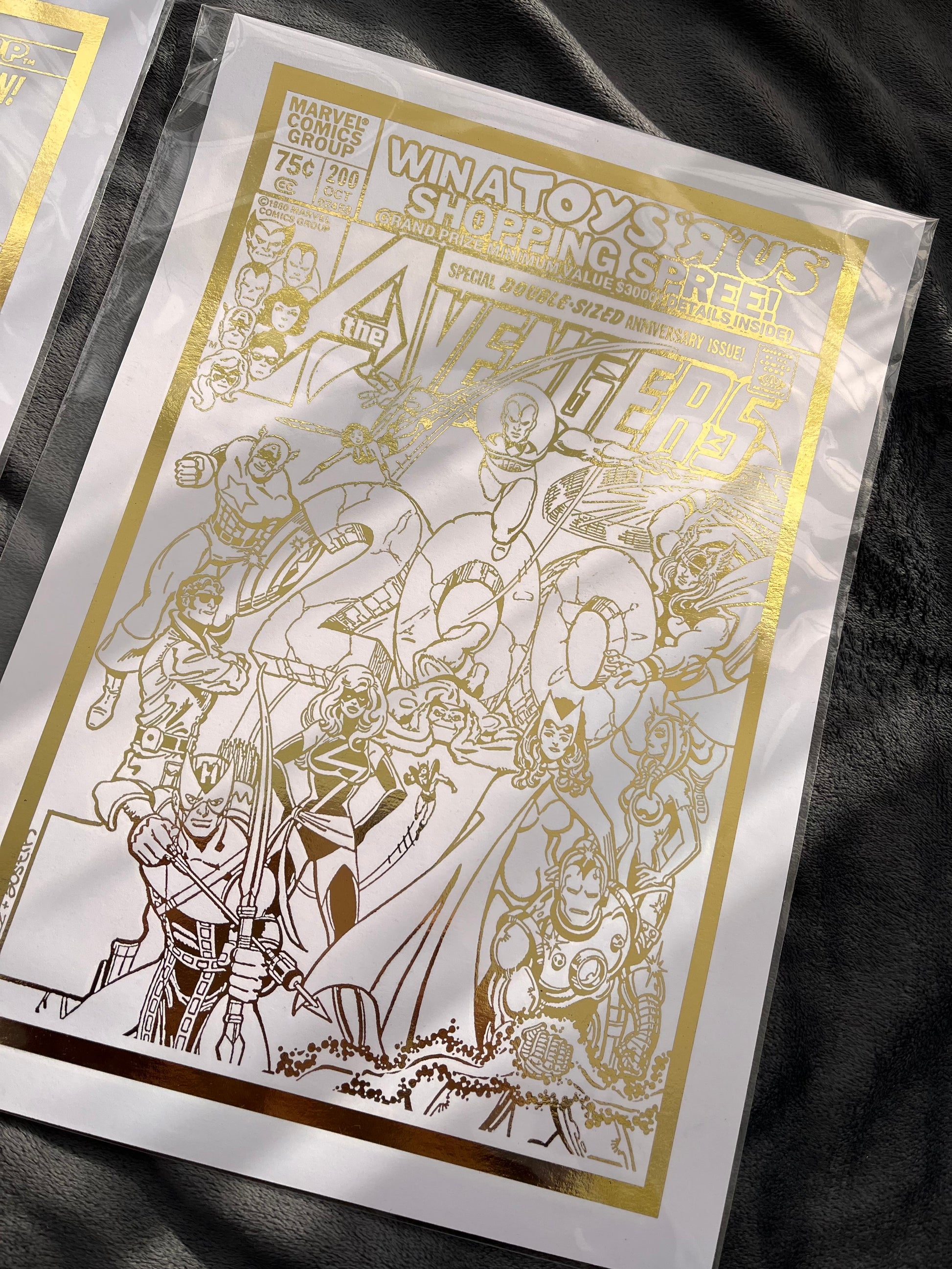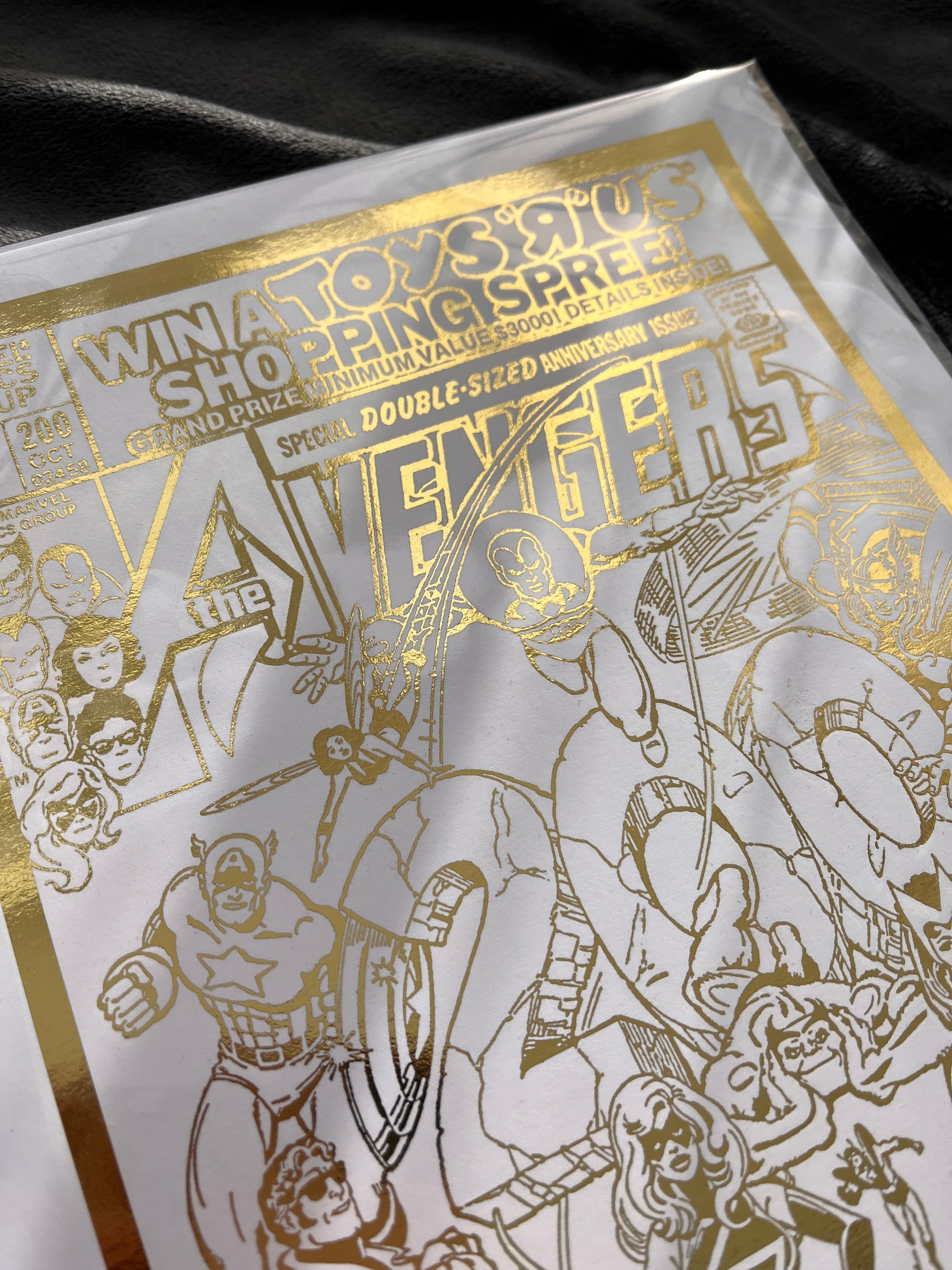 This vintage style foil printed set of two 'The Avengers' comic covers features the iconic 100th and 200th special edition issues from the classic series, printed with striking foil accents.