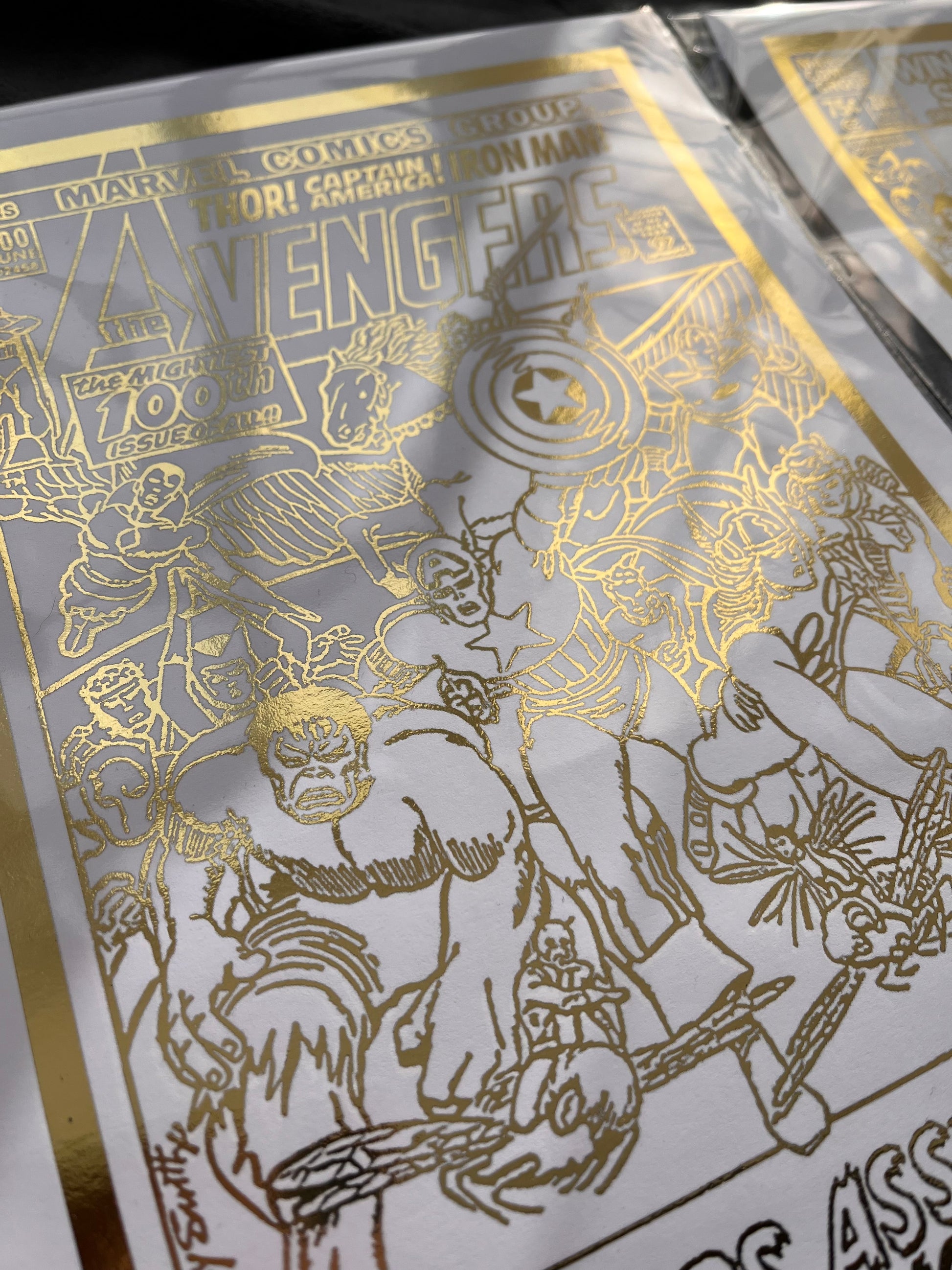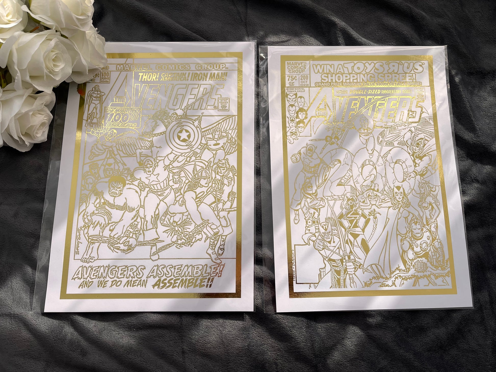 Celebrate the timeless appeal of The Avengers Comics with this vintage style foil printed set of two special edition comic covers.
