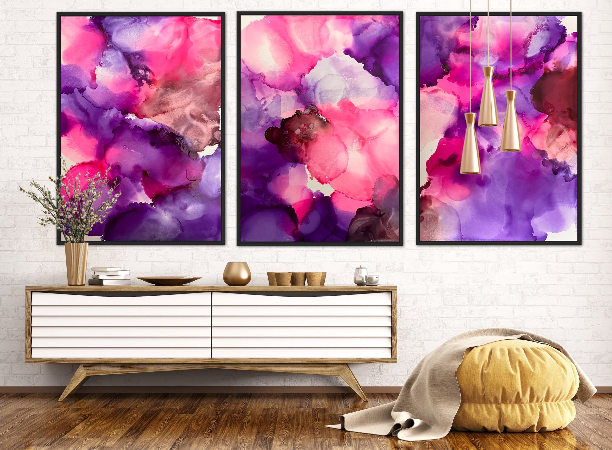 Our set of 3, pink and purple alcohol ink digital download is a great option for those who want an affordable and convenient way to add art to their home. Simply download the files and print them on your own printer or at your local print shop. Plus, since they are digital downloads, you can print them as many times as you like and use them to decorate multiple rooms.