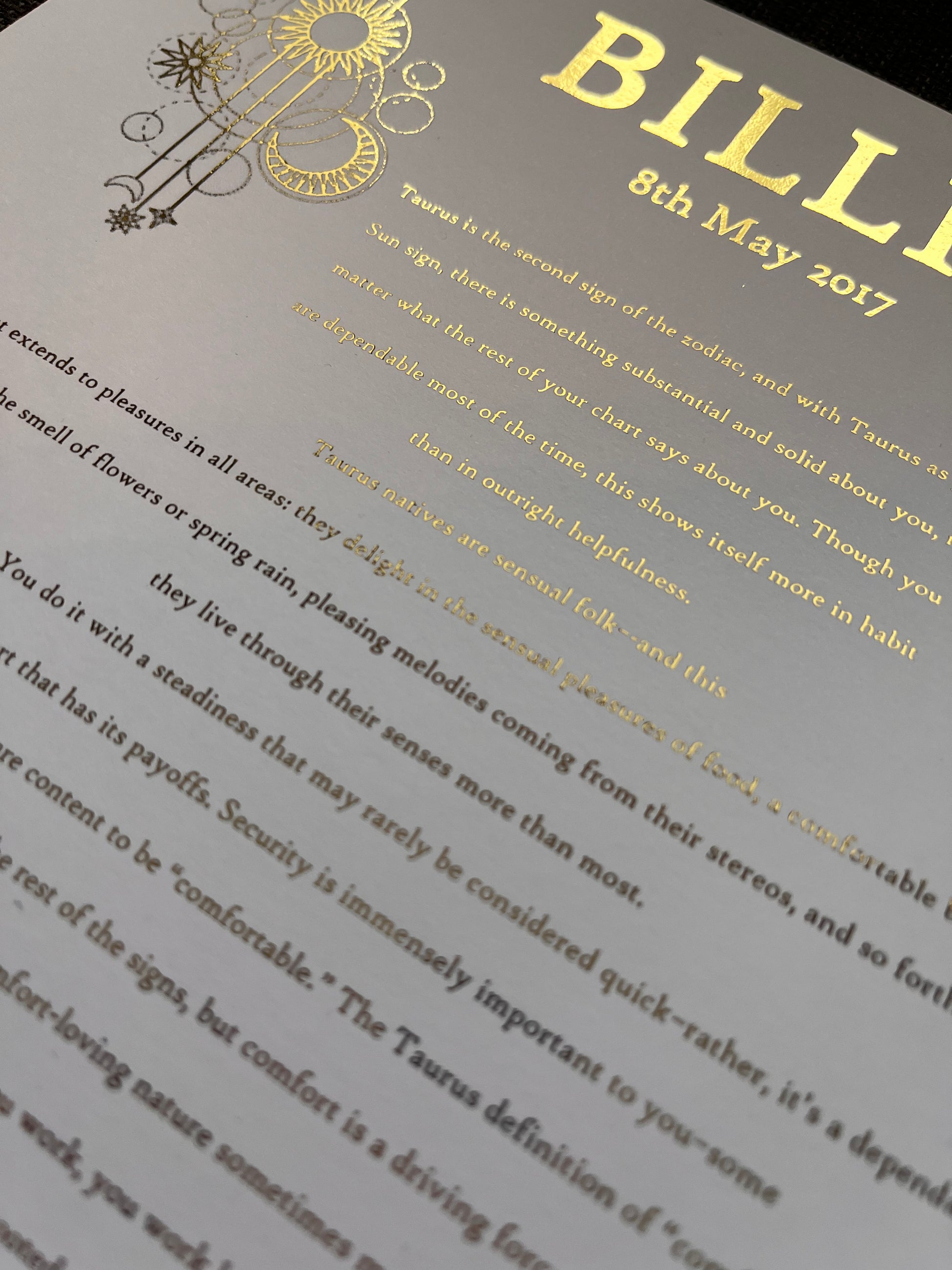 Crafted with precision and adorned with opulent gold foil accents, this collection includes your personalised birth chart, a stunning depiction of your zodiac star sign, and a beautifully written piece that delves deep into the essence of your star sign. Elevate your space with these celestial treasures and unlock the secrets of the cosmos that are uniquely yours.