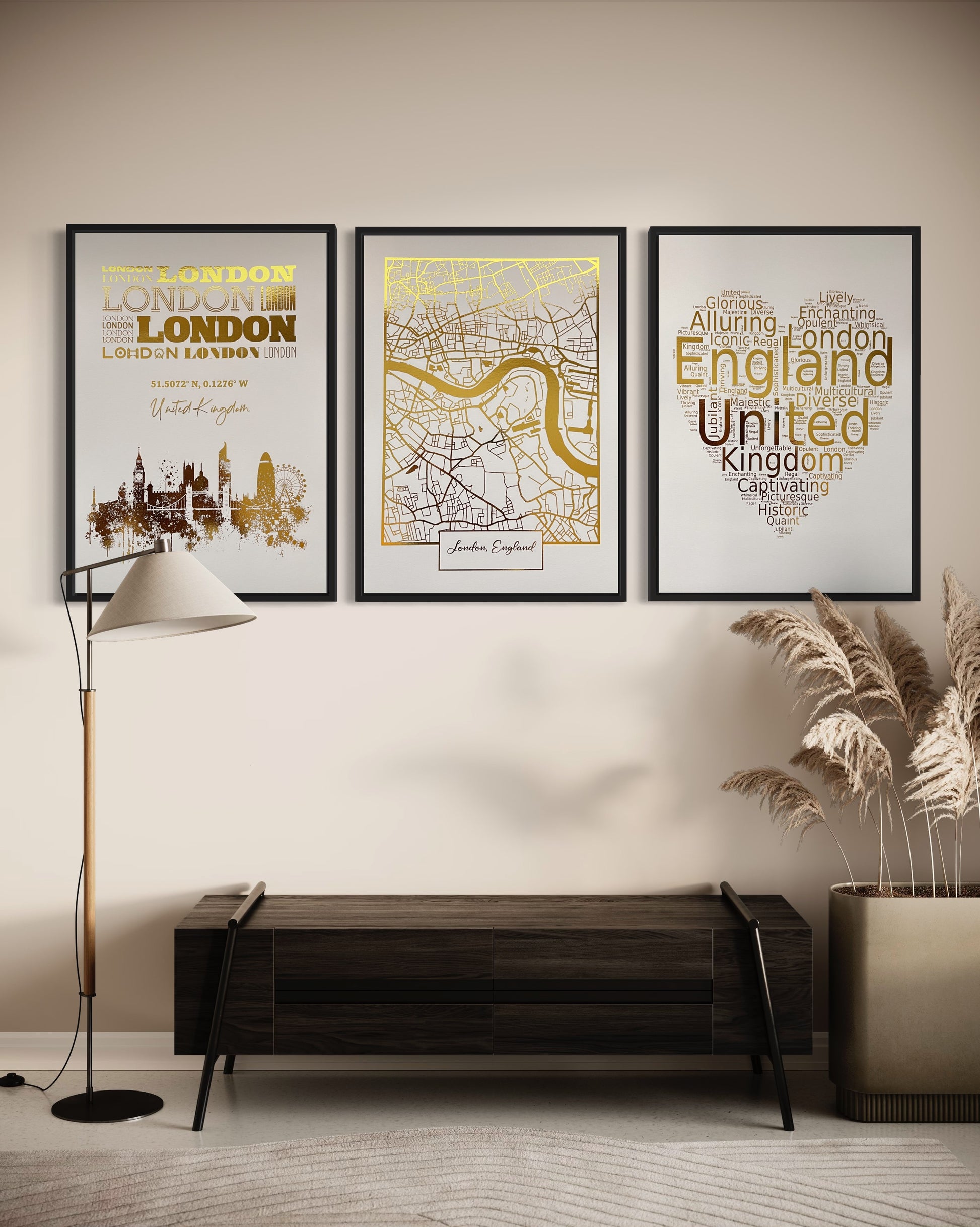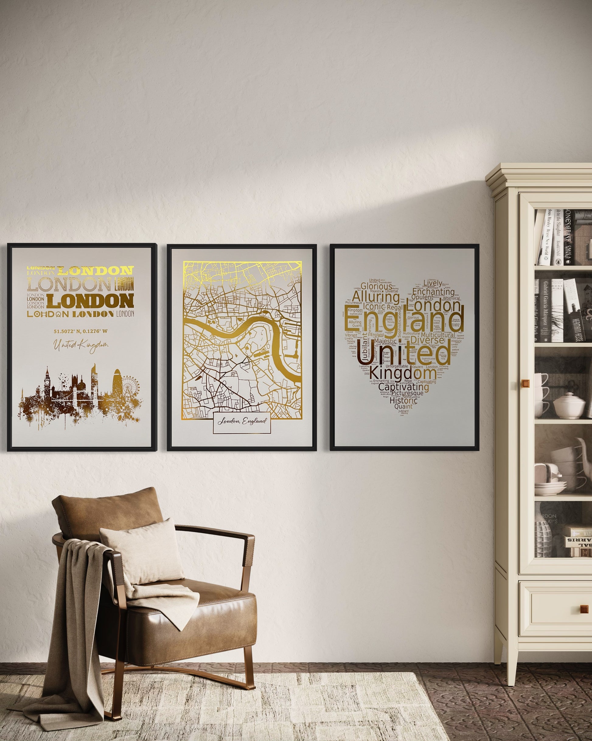 A captivating addition to any interior decor that celebrates the timeless beauty of the British capital. This meticulously crafted collection showcases the essence of London through a heart word cloud, a detailed map, and a stunning skyline picture, each enriched with luxurious gold foil accents. Elevate your living space with this elegant trio and let the charm of London sweep you away.