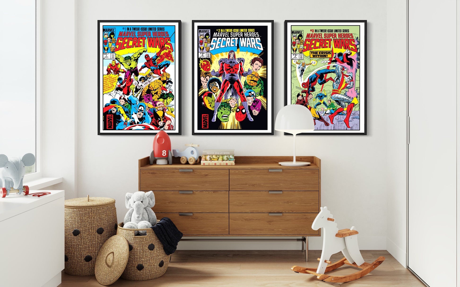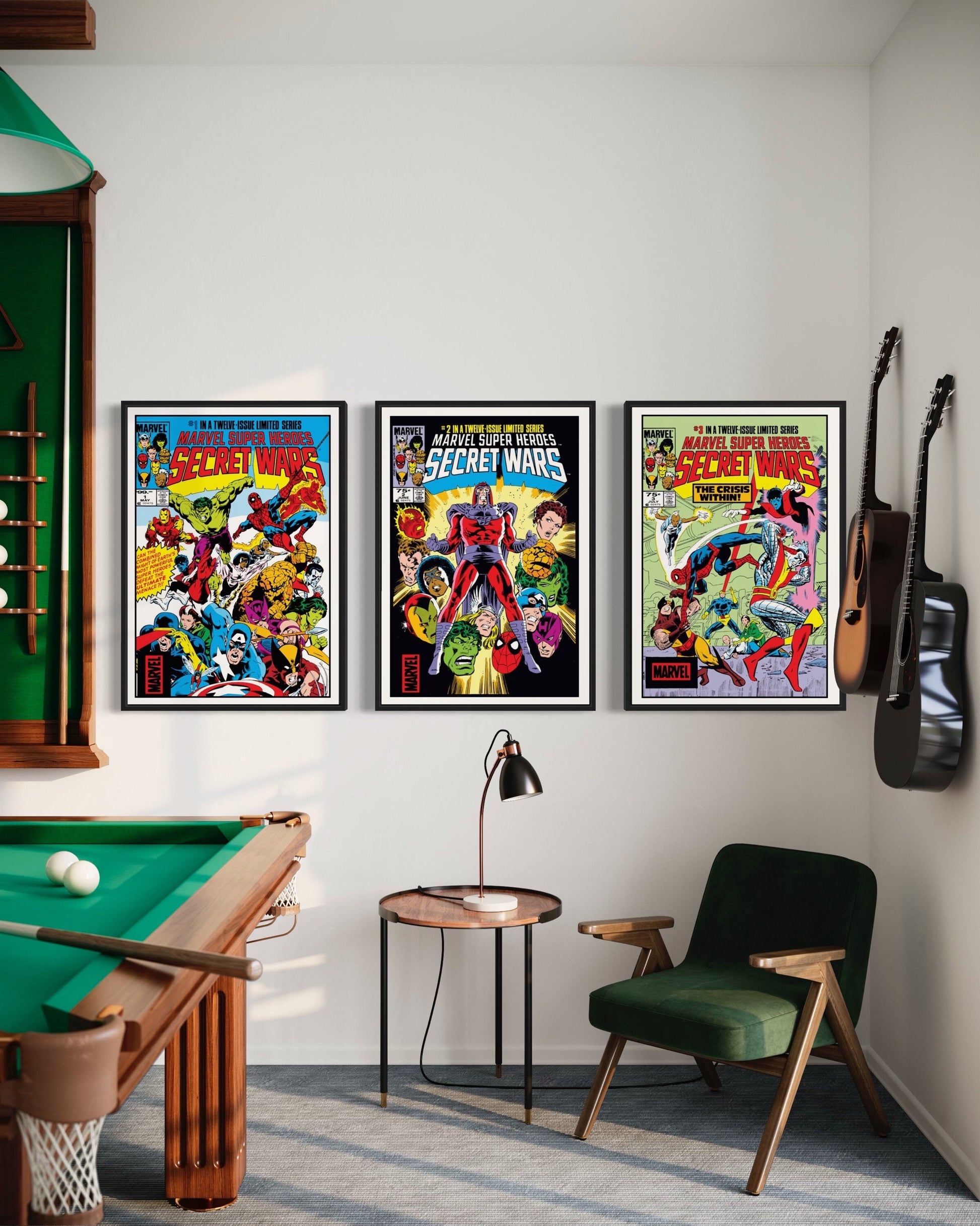 This set of Secret Wars comic cover prints is not only a visual feast for comic book enthusiasts but also a celebration of the rich storytelling and iconic characters that define the comic universe. It makes a perfect gift for comic fans, collectors, or anyone seeking to infuse their space with the dynamic energy and timeless appeal of these legendary comics.