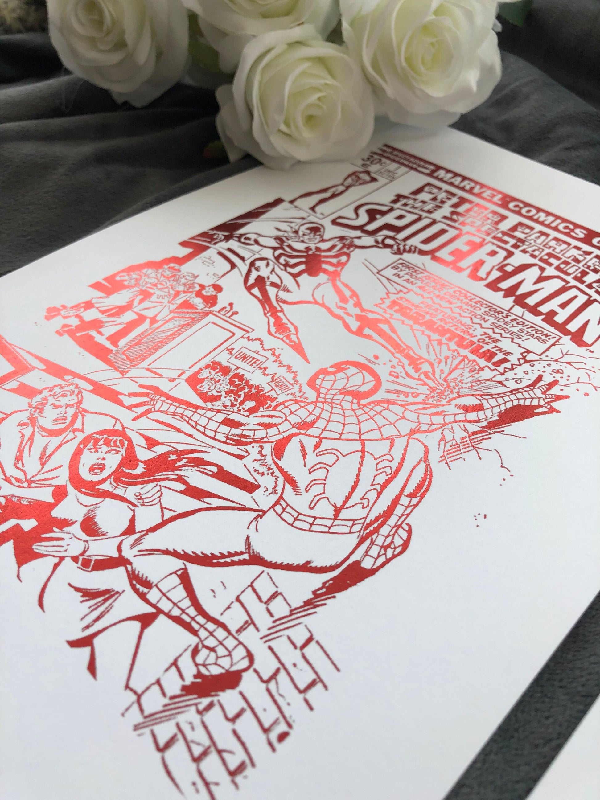 Bring some superhero style to your wall decor with this set of 2 Spider-Man comic cover and comic strip foil prints. Featuring a bold and bright depiction of Spider-Man in action, this print is sure to be a hit with fans of the iconic Marvel Comics character. The foil print adds a metallic finish that catches the light, making it stand out on your wall. This print is made on high-quality cardstock and comes in A5 and A4 sizes, making it easy to frame and display in any room. Whether you’re a die-hard Spider-Man fan or just looking to add some pop culture flair to your home, this foil print is a must-have.