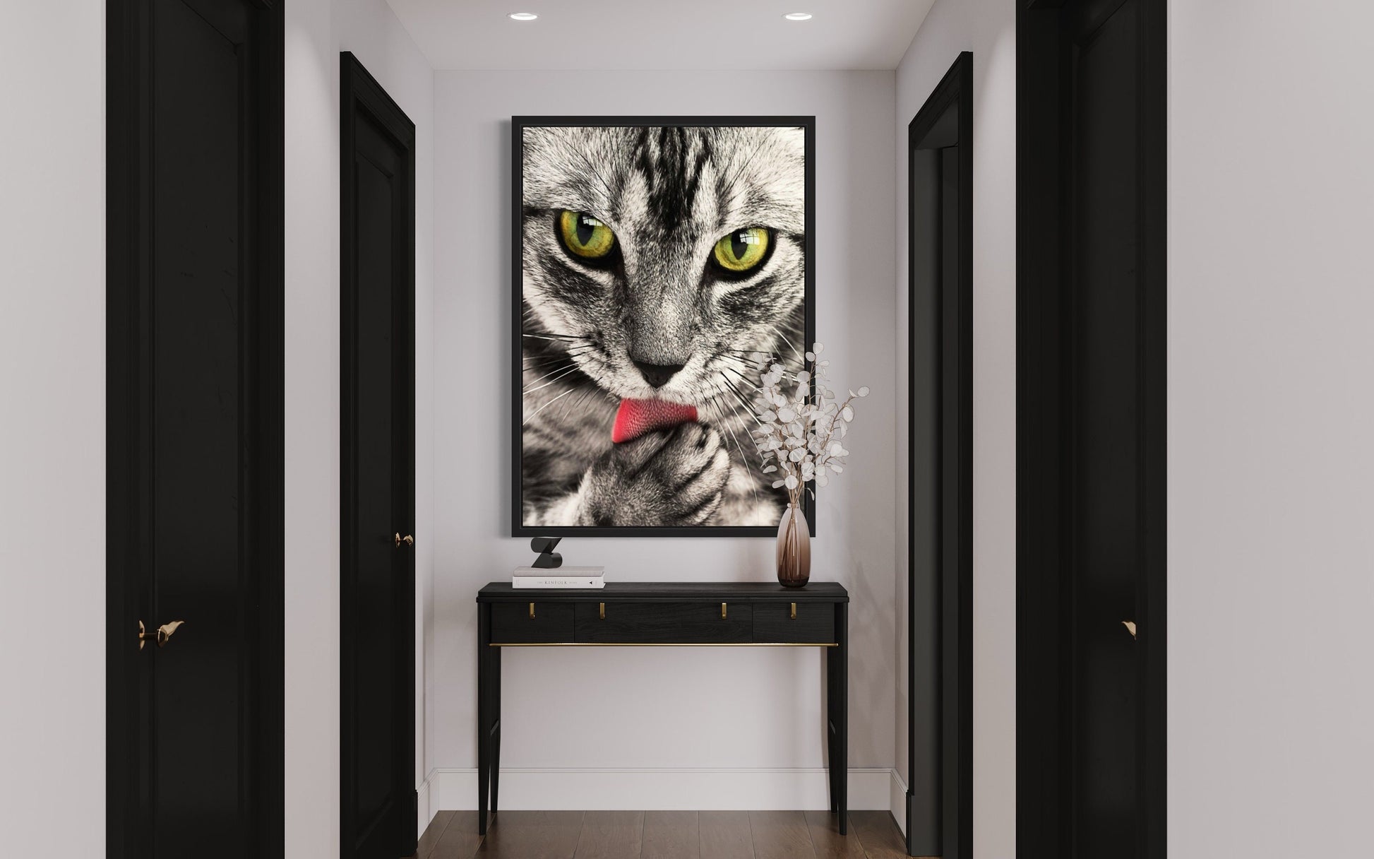 This enchanting artwork captures a mesmerising close-up of a black and grey tabby cat, delicately grooming itself by licking its paw, showcasing the innate beauty and mystique of these magnificent creatures.