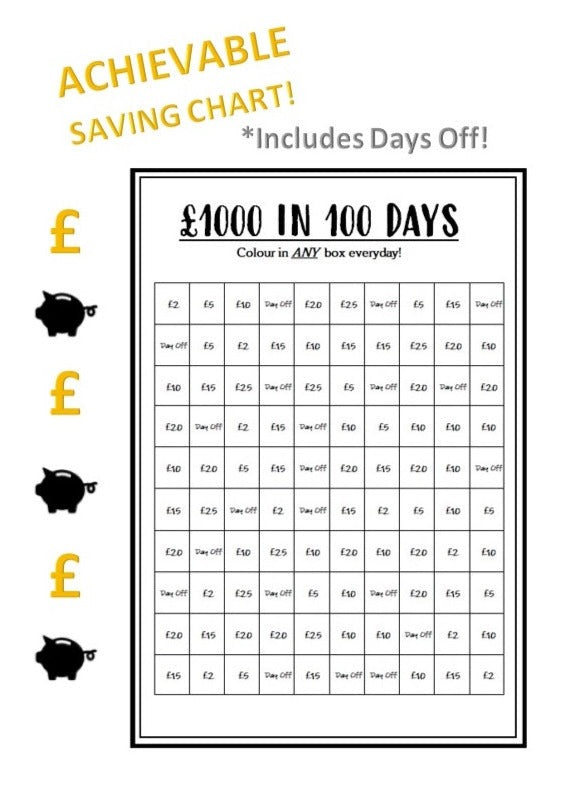 The Achievable Saving Chart, Save 1000 Pounds In 100 Days, Includes Days Off!