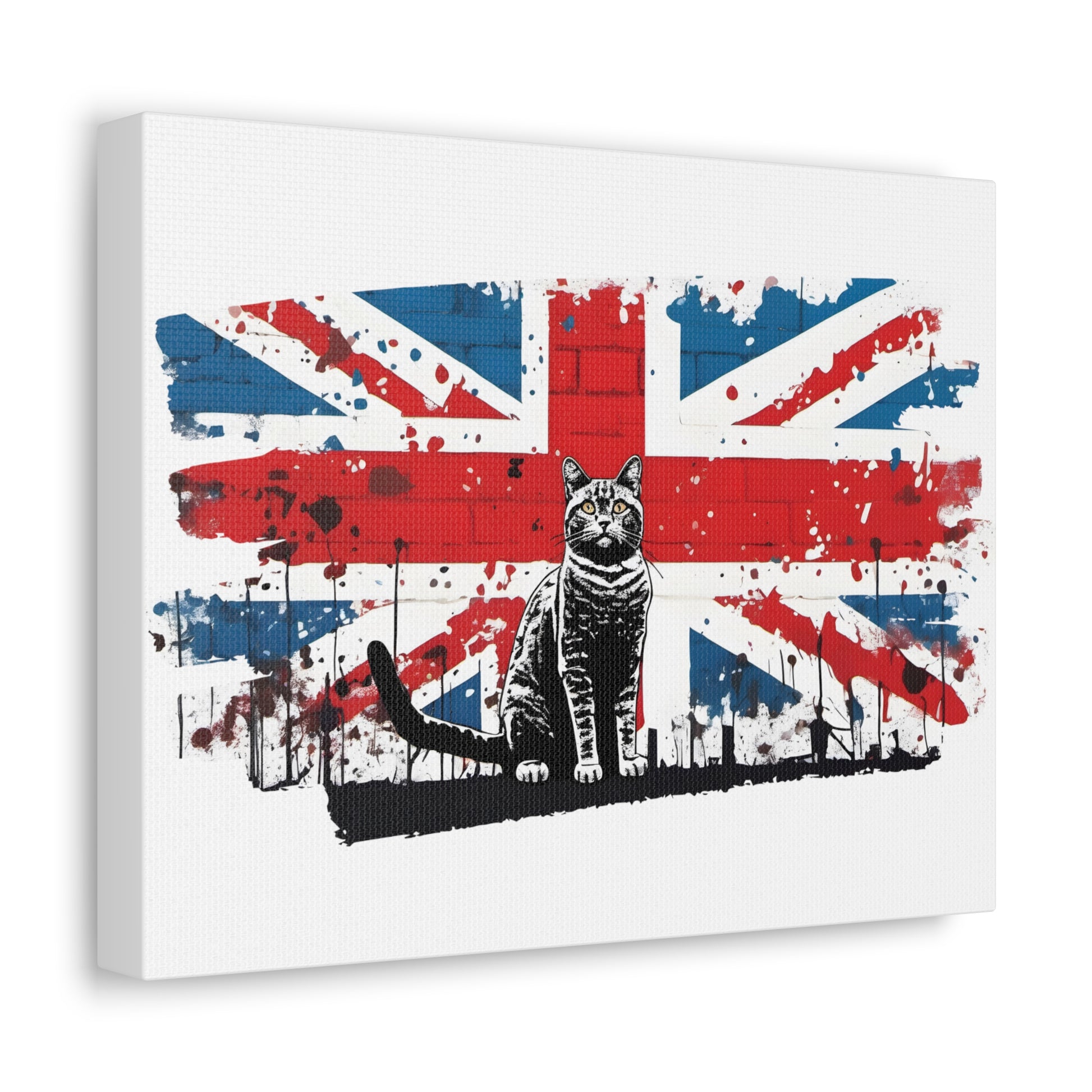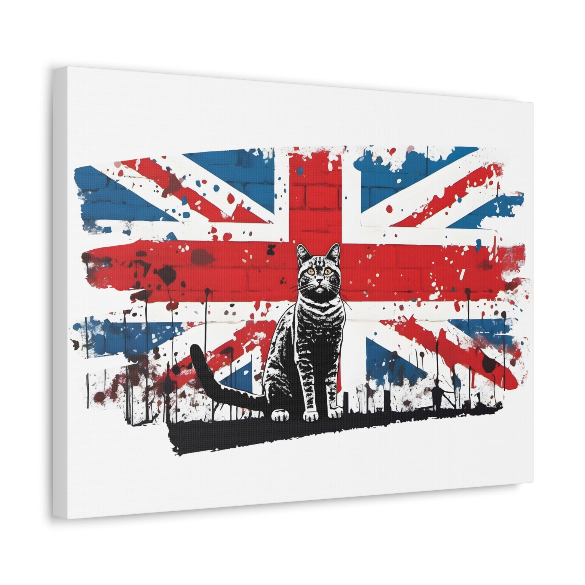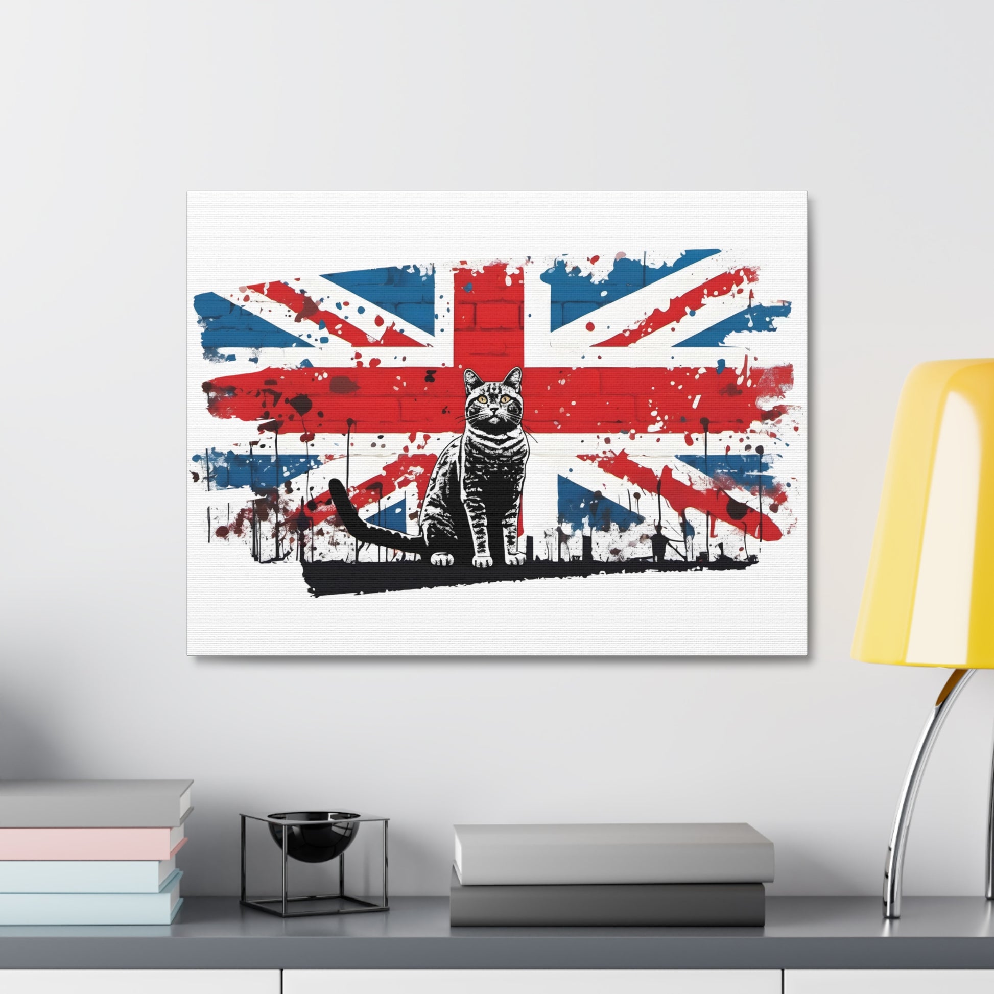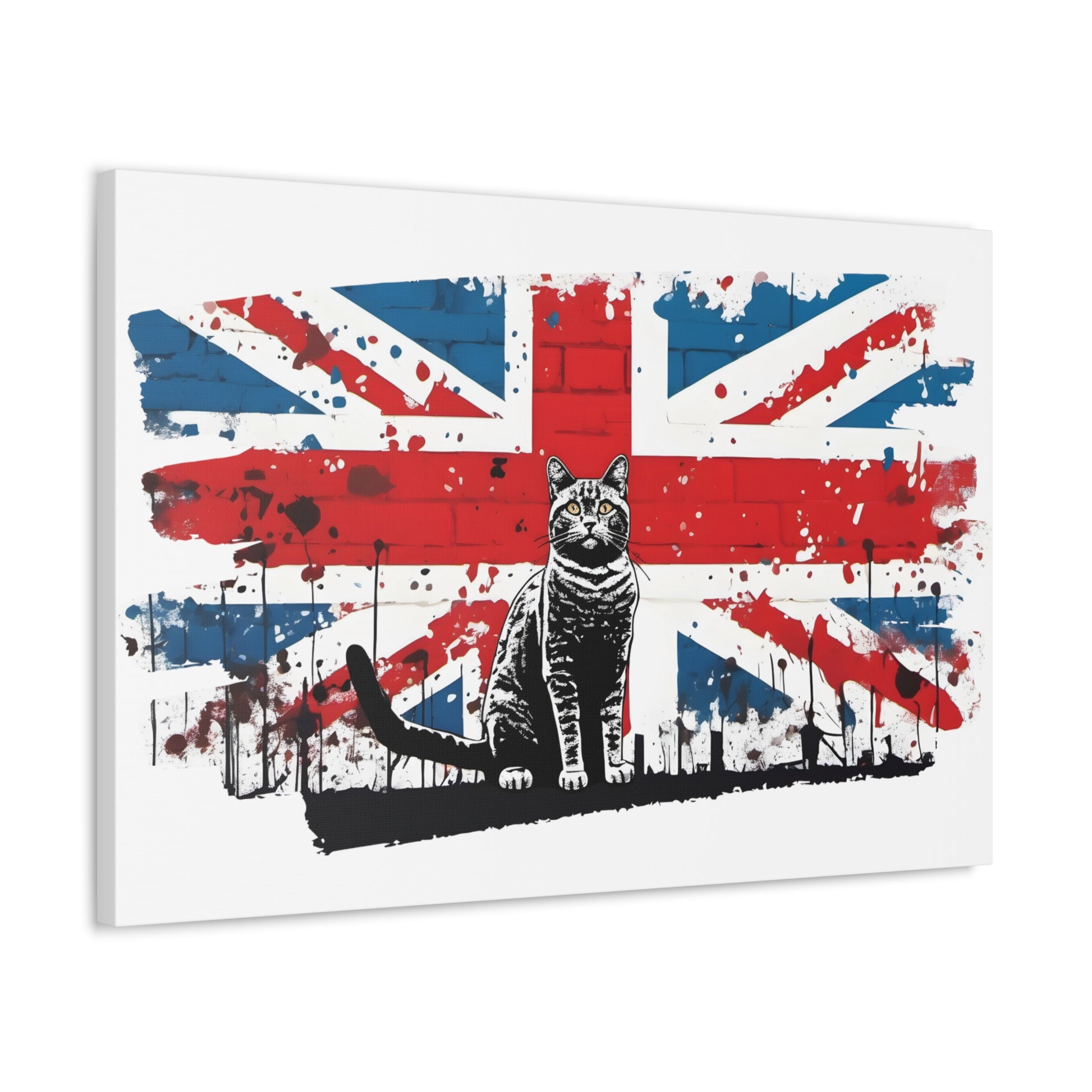 Embrace the rebellious spirit of street art with our canvas print, featuring an iconic Banksy-style depiction of the Union Jack flag and a cat. This striking artwork pays homage to the essence of British culture, blending patriotism with urban edge.