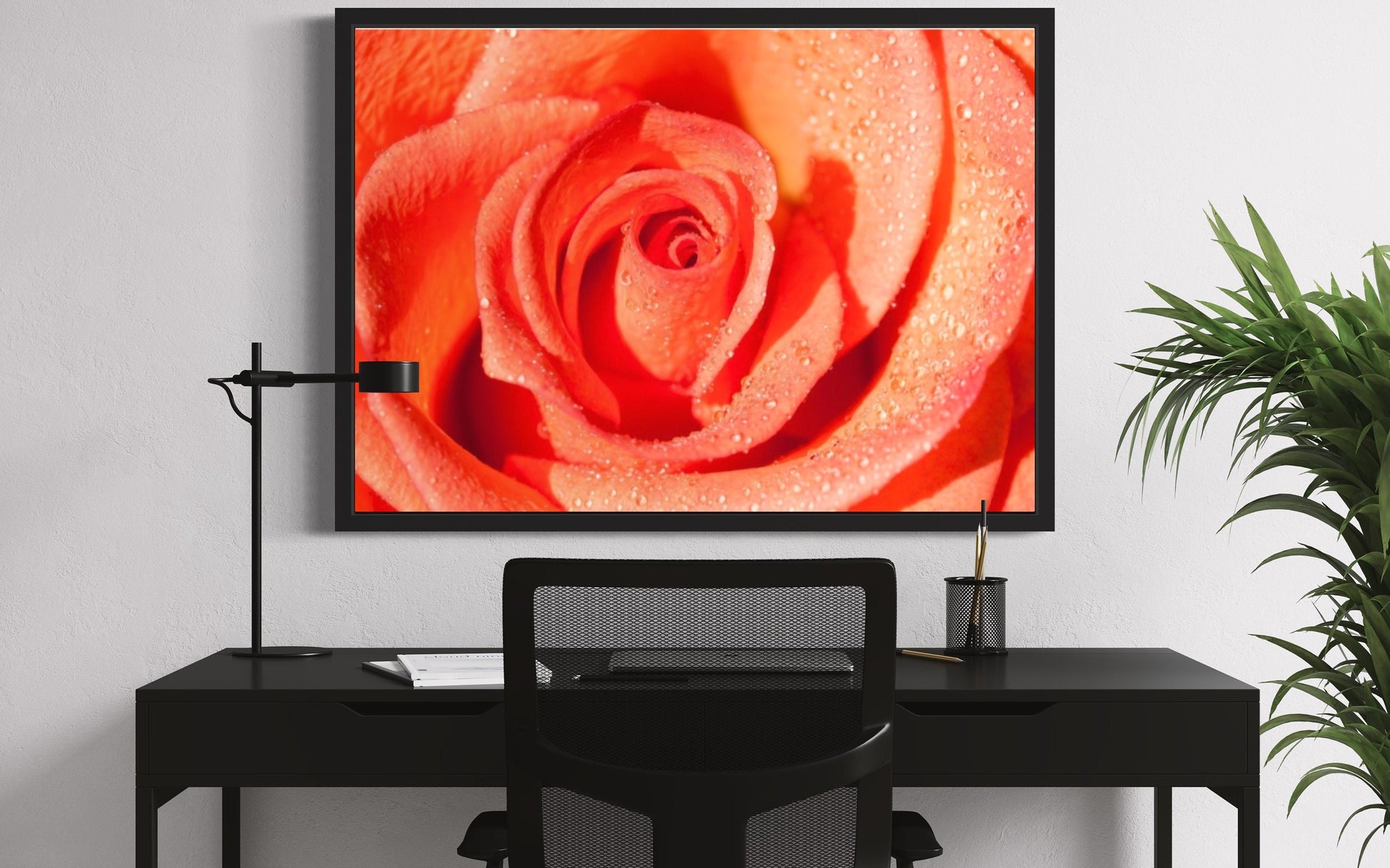 Capture the essence of nature's beauty with this captivating up-close photograph of an orange rose glistening with delicate water droplets. Each element of this image has been meticulously captured, showcasing the vibrant hues and intricate details that make this rose truly exceptional.