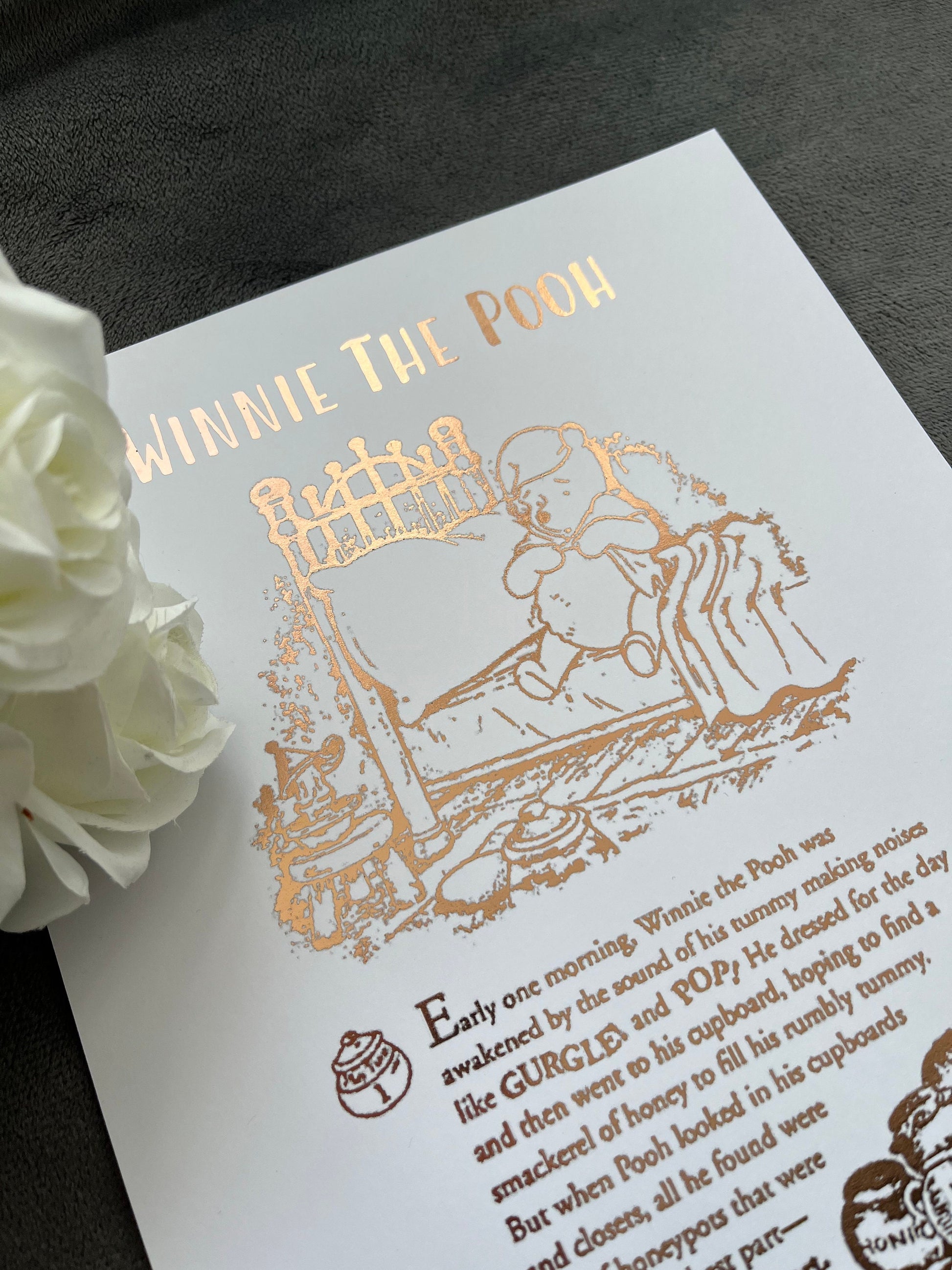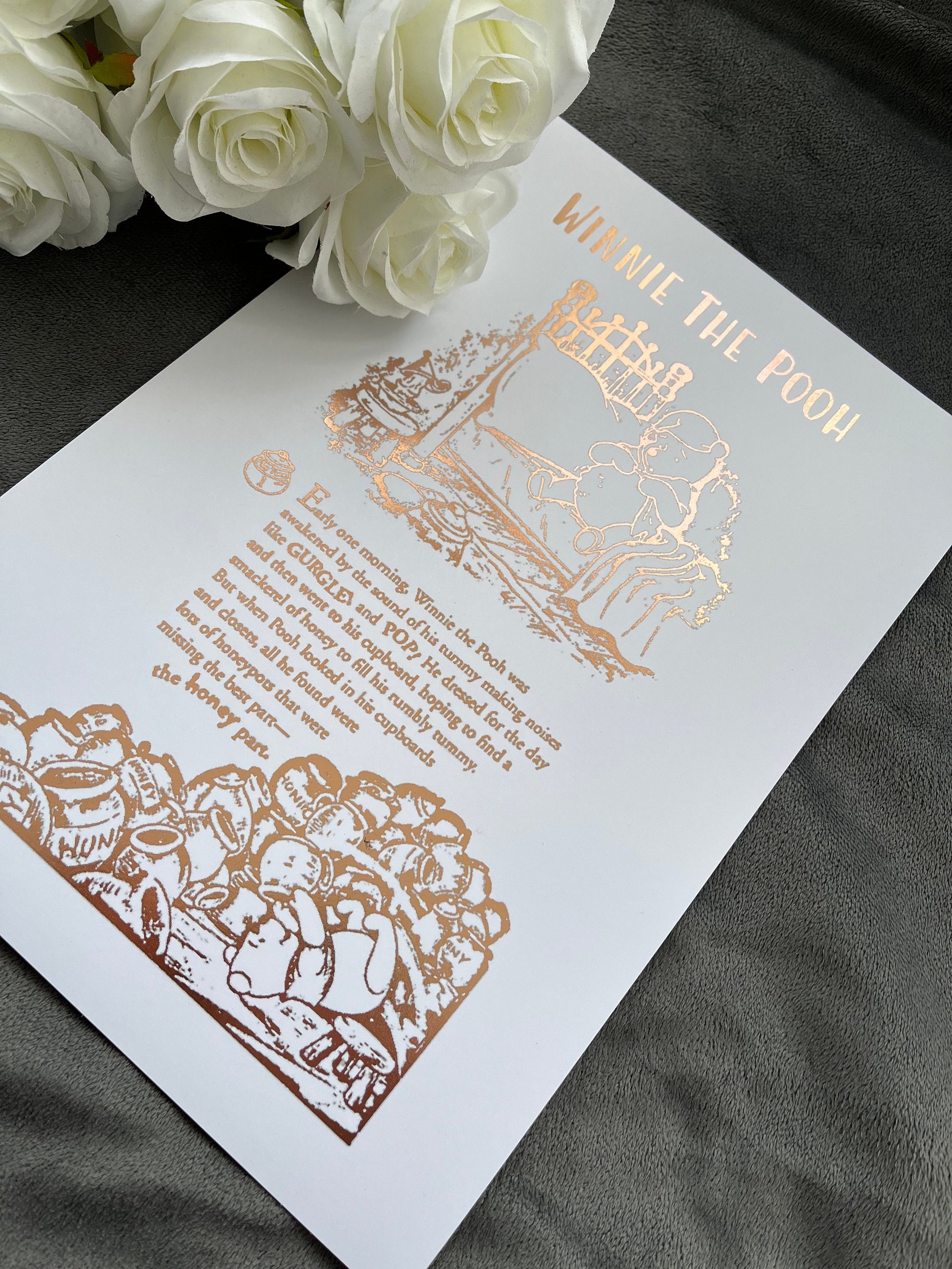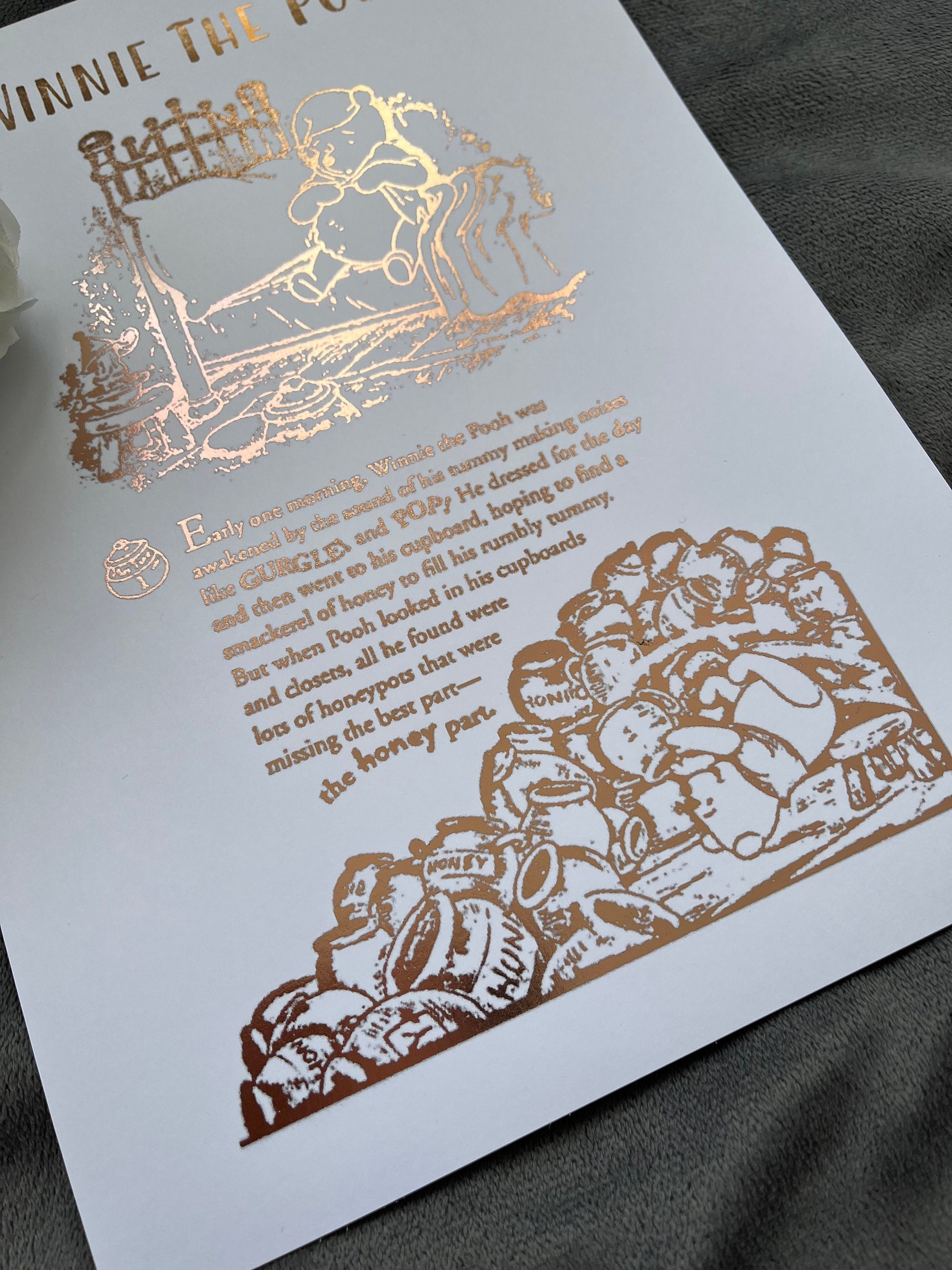 A rose gold foil printed, classic scene in the iconic, illustrative book.