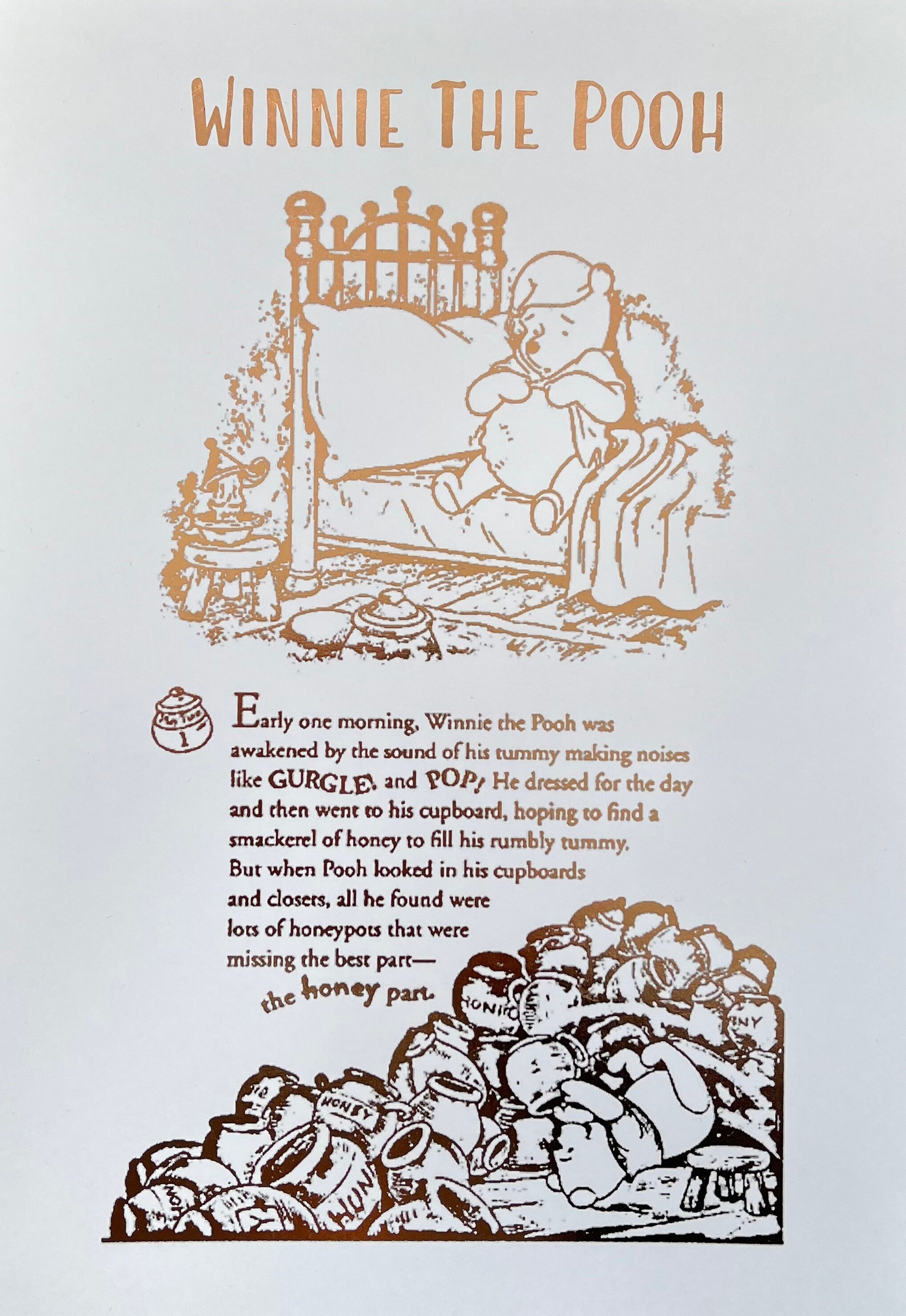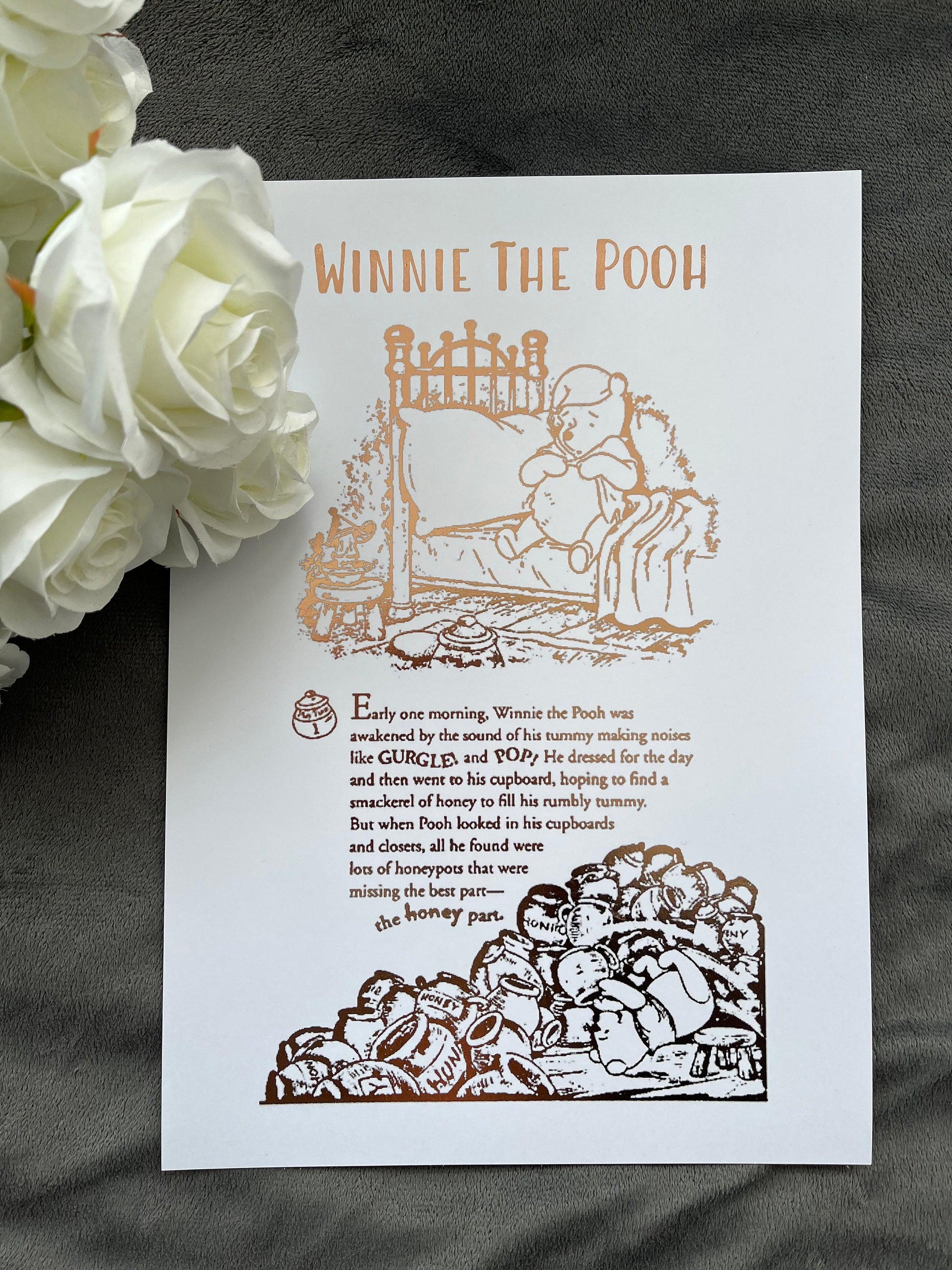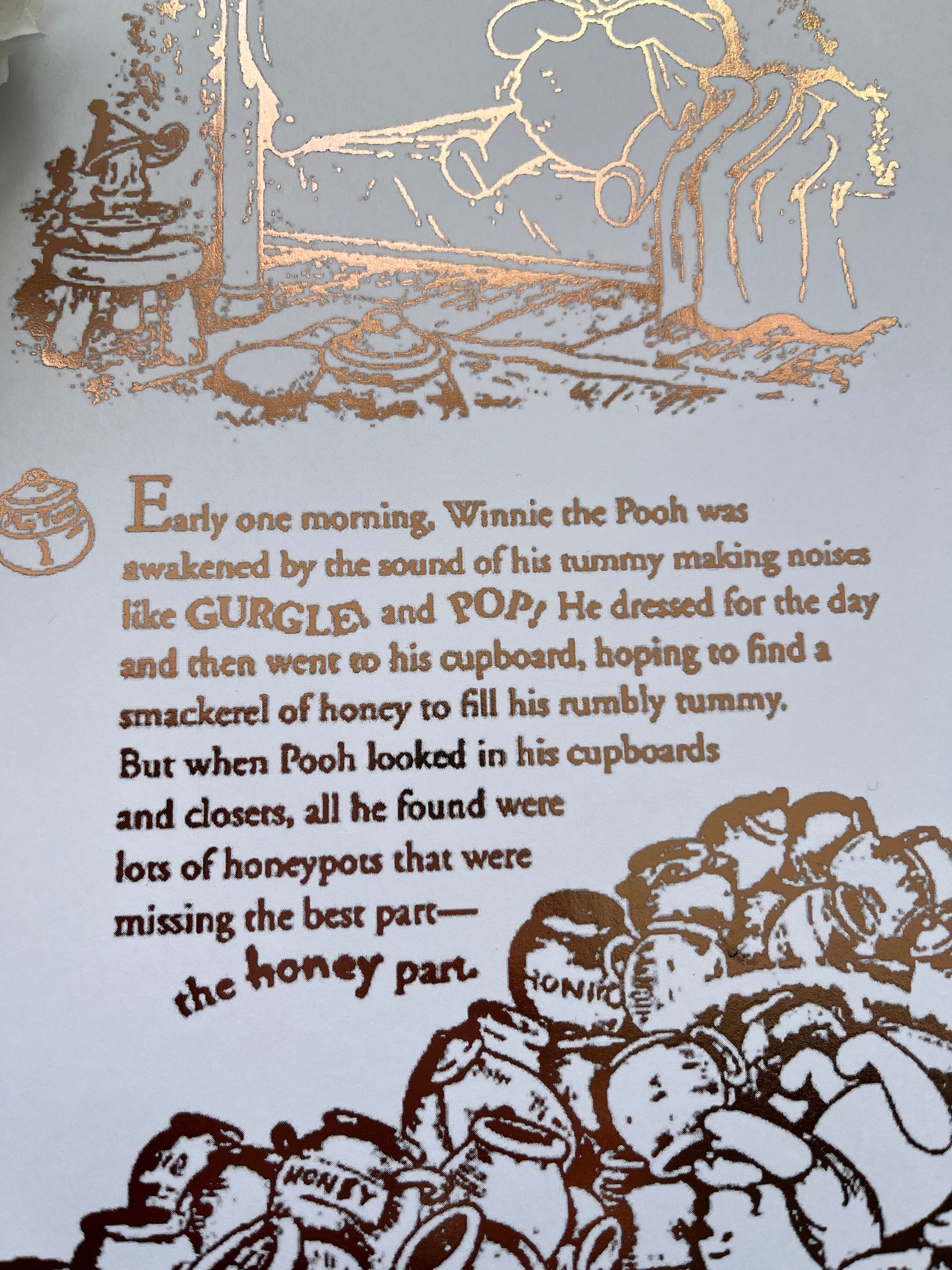 A rose gold foil printed, classic scene in the iconic, illustrative book.